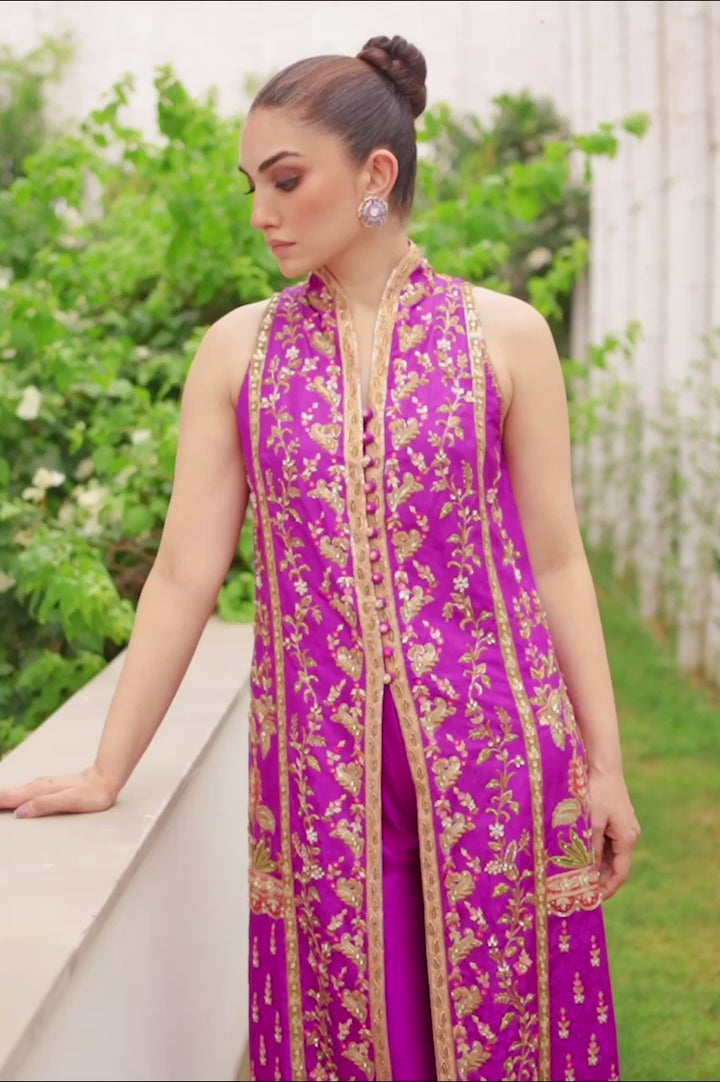 Cut from a royal violet self jamawar, the flattering silhouette of the jacket offers relaxed elegance. Witness artisanal finesse in the zardoze and resham embroidery accented with gota details and peach applique borders. The burnt orange and olive green elements of nature are layered intricately for a poignant charm. The pure rawsilk trousers, featuring embroidered slits, uplift the festive flair of the outfit.