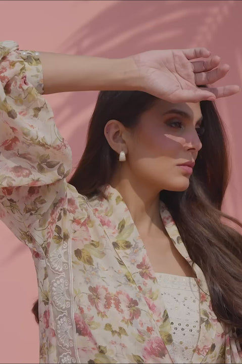 A soft cascade of vintage florals drapes the beige georgette silhouette in a palette of earthy hues, evoking the romance of sun faded gardens. The front open shirt, with its painterly blooms comes iwth an attached predraped dupatta with scallop detailing on the borders framed by delicate lace edging that lends texture and quiet intricacy. Beneath, a tonal inner ensemble offers gentle contrast, allowing the translucent layers to create depth and fluid motion. Effortless yet poetic, the look captures a mood of graceful femininity and timeless charm.