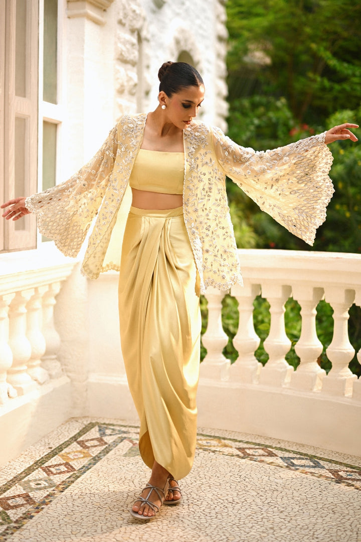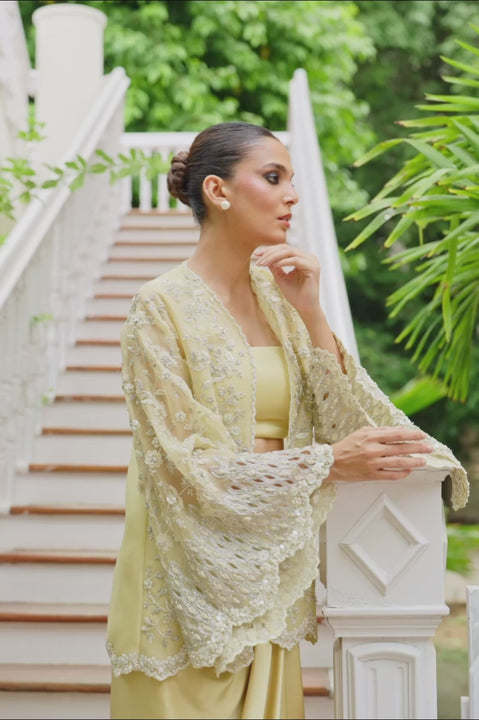A luminous drape in molten butter yellow, this ensemble pairs a structured charmeuse bandeau with a pre draped skirt, sculpted in soft pleats for effortless movement. The sheer organza jacket, cut in a relaxed silhouette, shimmers with silver and tonal resham florals, zardoze accents, and scalloped edges. Flared sleeves with scalloped hems add a note of dramatic grace, completing the look with radiant poise.