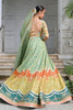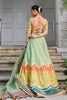 Exude elegance this festive season in this beautifully printed khaadi silk, gota and hand worked peshwas. The bodice, in a geometric pattern, effortlessly flows into a mint green hued printed peshwas. The matching organza dupatta with gota embellishment ties the piece in harmony.