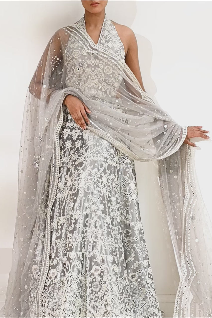 A celestial peshwas in ash silver tissue, lavishly adorned with ivory eyelet embroidery, sequins, and mirror accents that weave a tapestry of timeless romance. The sleeveless bodice, cut in a plunging V, flows into a voluminous flare layered with intricate detailing. A sheer tulle dupatta, edged with scalloped embellishment and scattered mirrors, drapes with regal poise, completing the ethereal ensemble.
