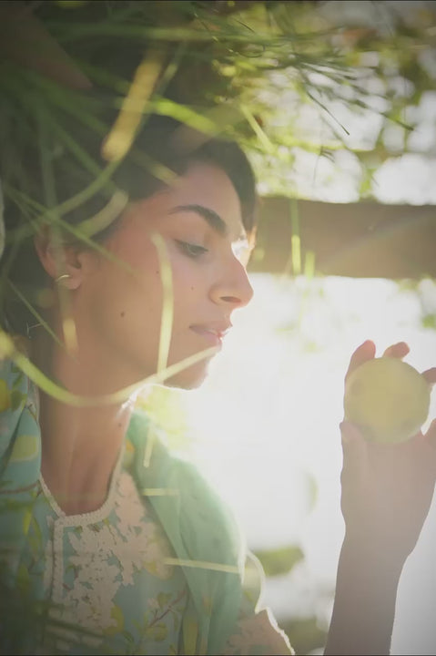 Welcoming the spring season, a mint jacquard lawn shirt makes a fresh statement with a scattered citrus and foliage print in soft lemon and muted olive tones. Contrasting aari embroidery defines the neckline and sleeve hems, lending subtle definition. The look is paired with an ivory jacquard lawn shalwar, finished with embroidered lemon motifs and slit detailing along the hem. A sheer printed chiffon dupatta echoes the citrus theme in mint and lemon yellow tones, completing the ensemble.