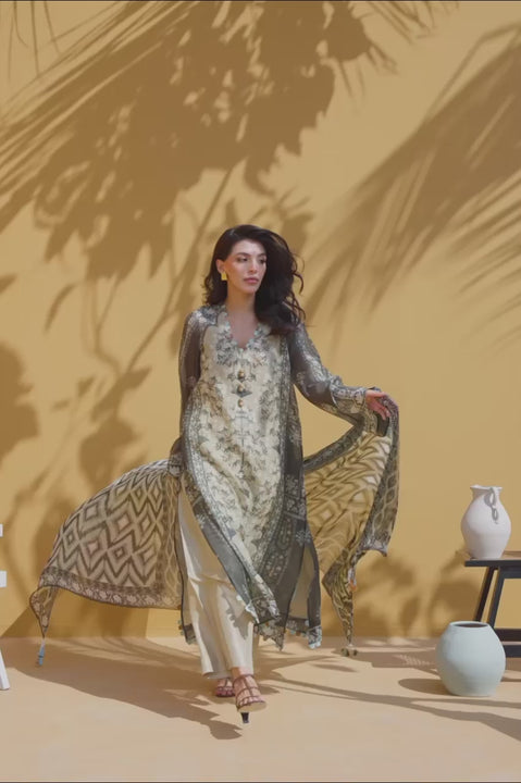 In an earthy palette, this ensemble layers deep olive and dove grey prints over a creamy almond canvas. The A-line shirt, crafted from cotton net, drapes with graceful ease and features a symmetrical botanical print reminiscent of damask artistry. Delicate fabric manipulation and button detailing accentuate the long sleeves and neckline. Paired with cream-toned pure raw silk culottes, the look balances rich artisanal patterns with a light, fluid silhouette.