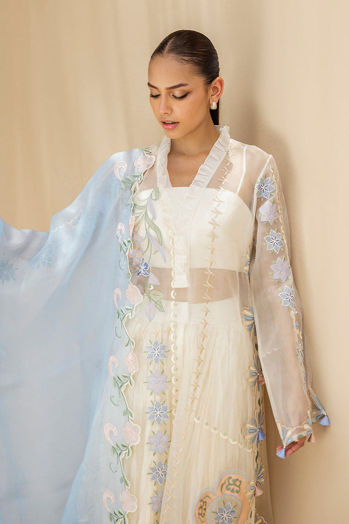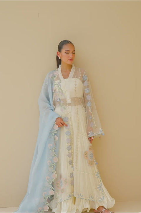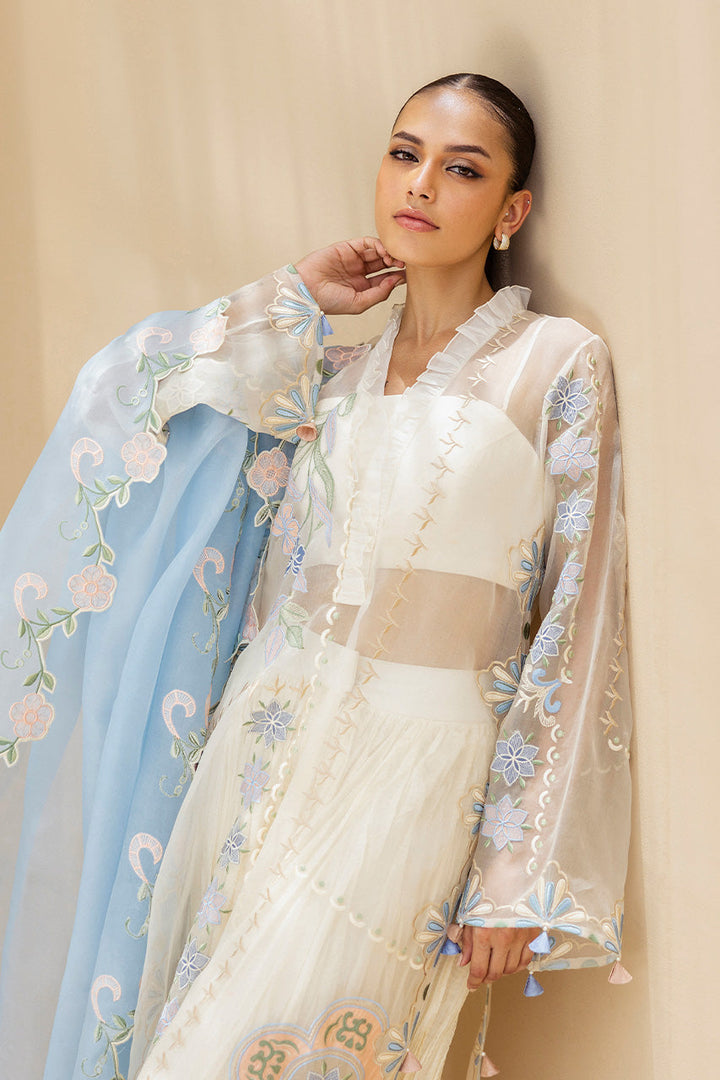 A luminous ivory pure rawsilk tube top is layered beneath a sheer organza kaftan shirt, adorned with appliquéd florals in soft lilac, peach and powder blue. Scalloped edges and delicate resham embroidery lend a whisper of whimsy. It is paired with crushed khaddi silk flared pants that cascade into soft swirls at the hem. A misty blue organza dupatta, finished with scalloped floral vines along the embellished borders, completes the look with a sense of quiet romance and understated elegance.