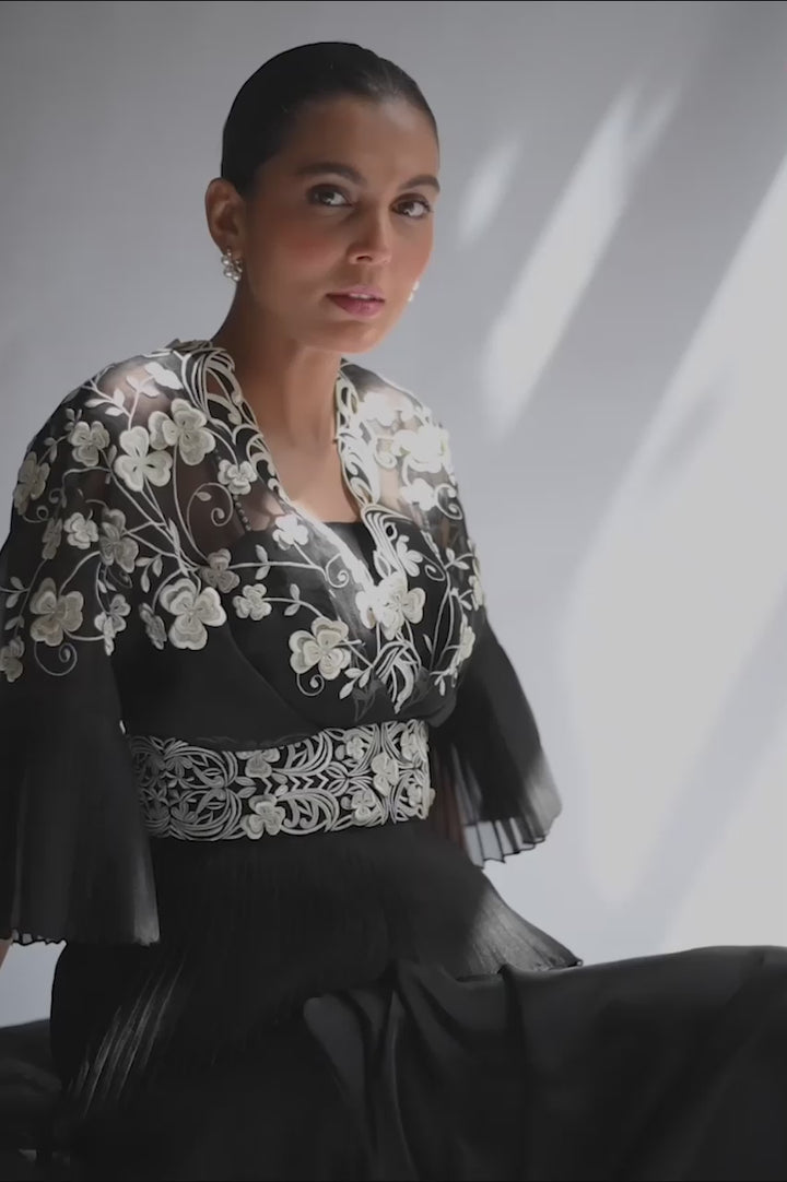 A black organza top is embroidered with contrasting white 3D flowers and detailed with a pleated bodice and sleeves. A wide embroidered belt cinches at the waist to add drama and shape. Paired with a charmeuse skirt that effortlessly flows.