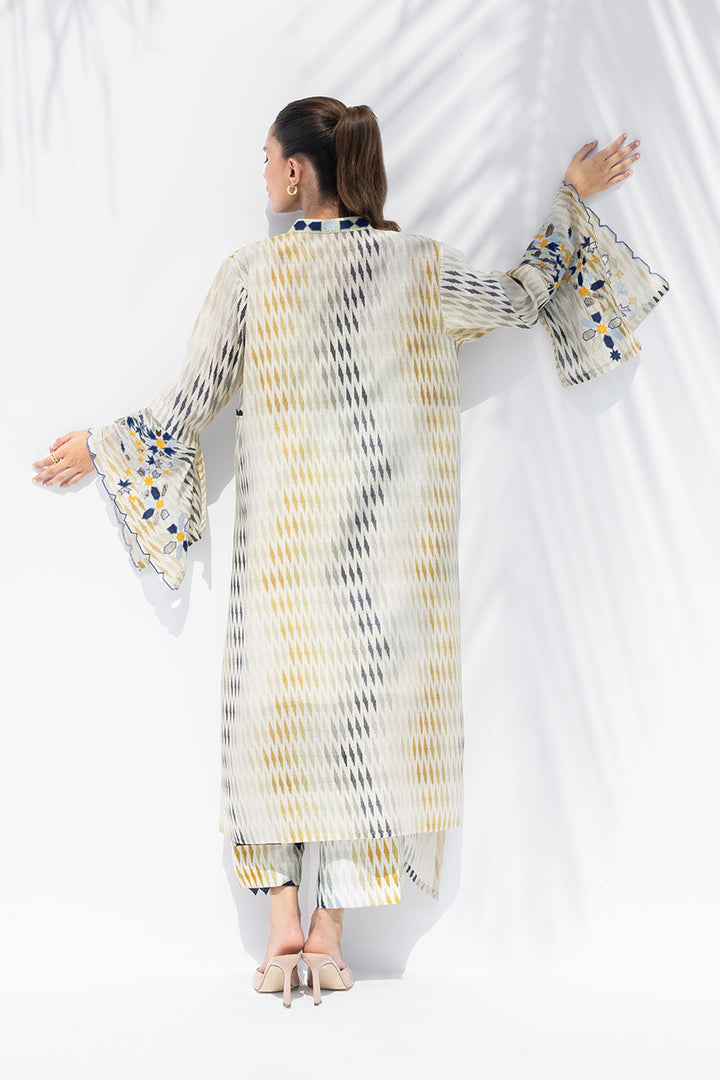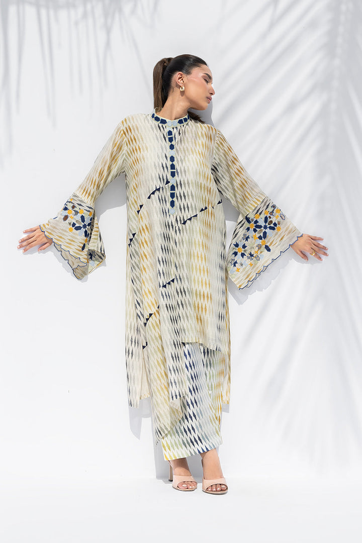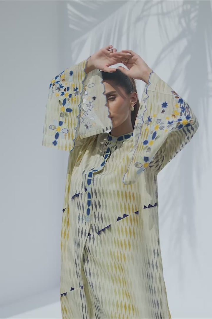 A canvas of eucalyptus green, beige, and indigo silk, this ensemble explores geometry through bold, abstract design. The relaxed shirt features an asymmetric hem, a band collar, and a button-down placket, with geometric appliqué and tukri detailing adding depth to the design. Fluid bell sleeves are elegantly finished with appliqué in shades of indigo and gold and a cutwork hem. Paired with complementary culottes that echo the artisanal tukri work, the look forms a cohesive, contemporary print-on-print expression.