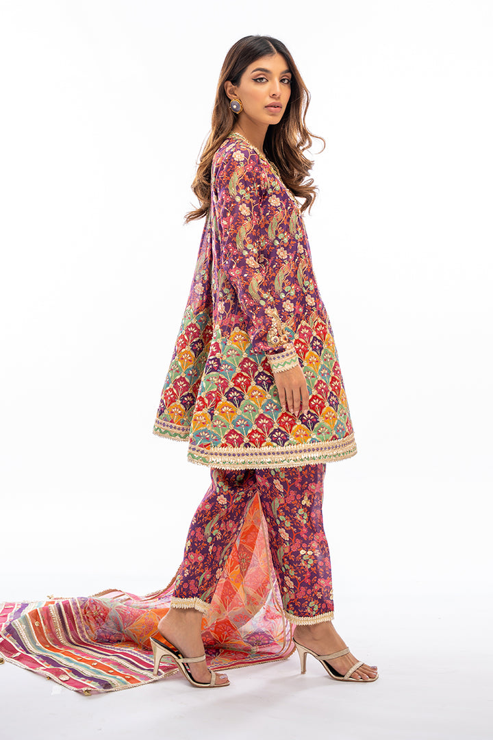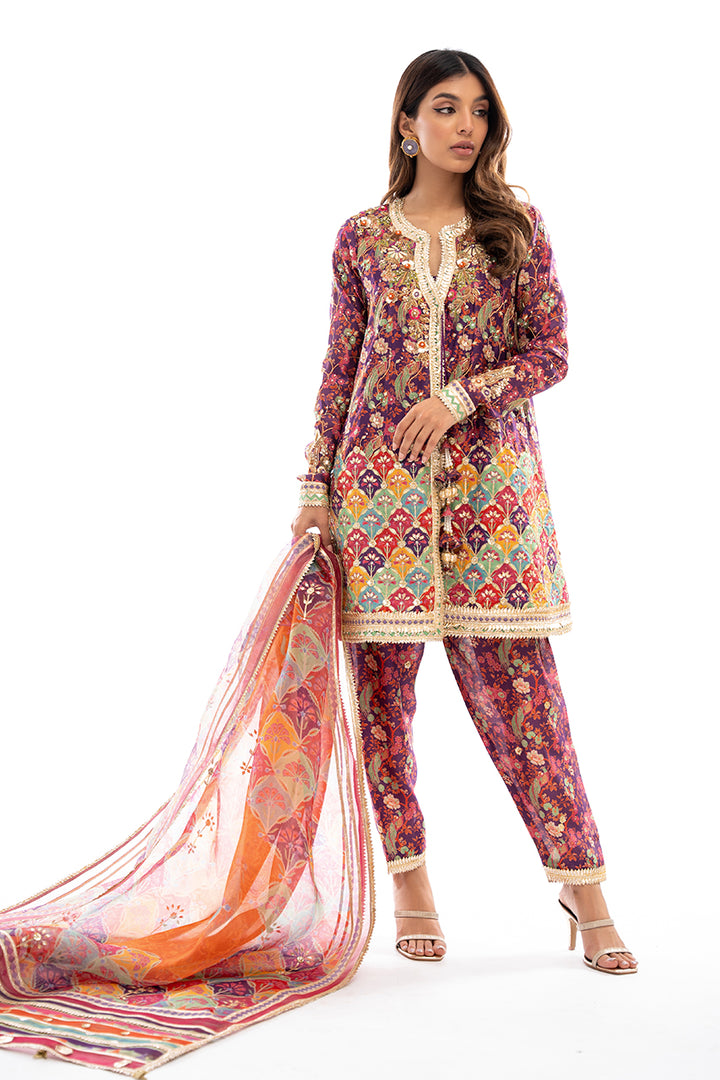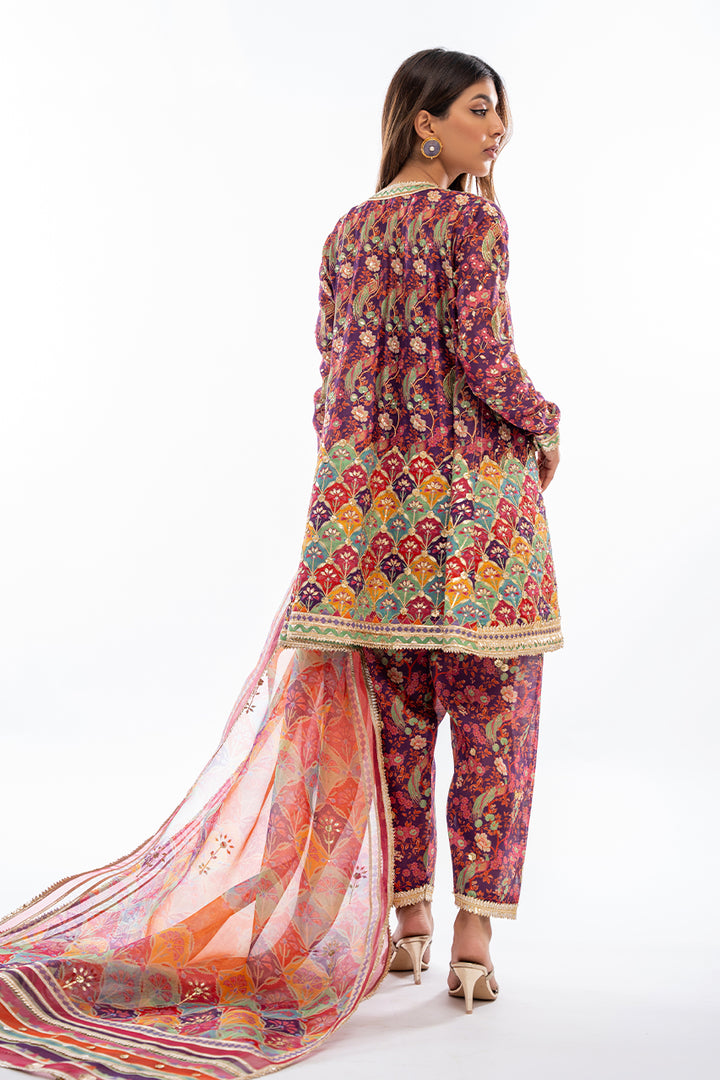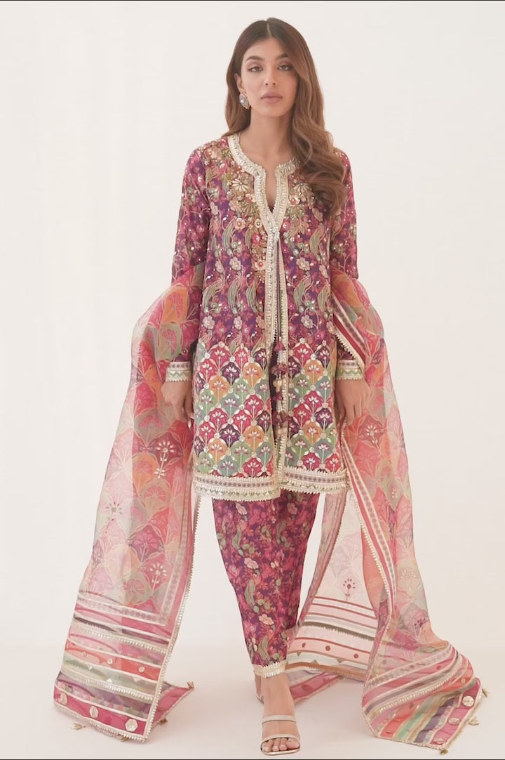 This short, plum coloured angarkha is the embodiment of a classy yet charming festive look. It is rendered with a thoughtful arrangement of zardoze and gota work on a floral-printed khaddi silk, featuring a chatapatti border. A multi-coloured dupatta with gota finishing and a printed shalwar add the final touches to this ensemble.