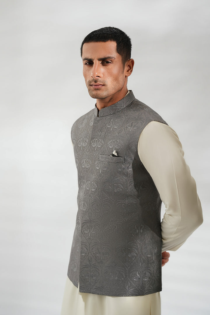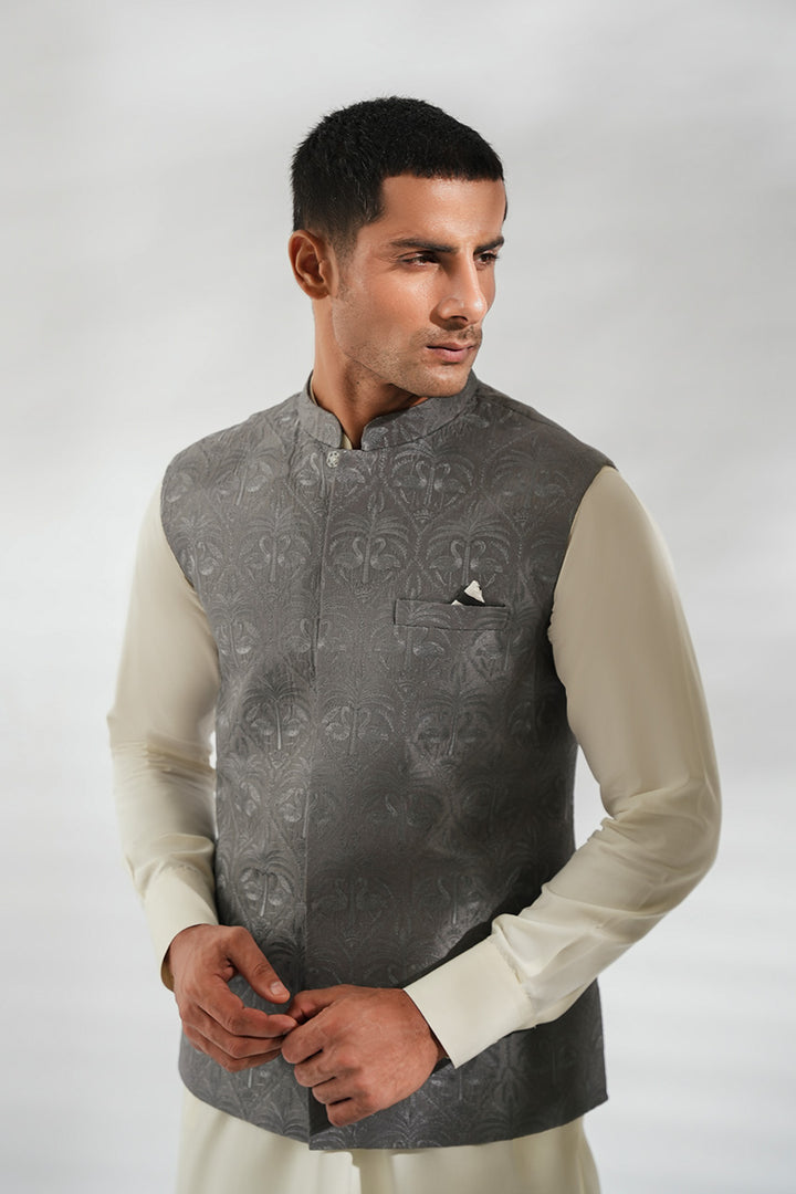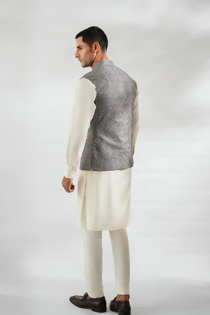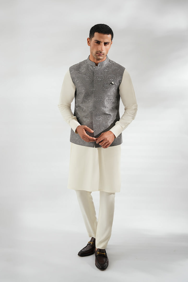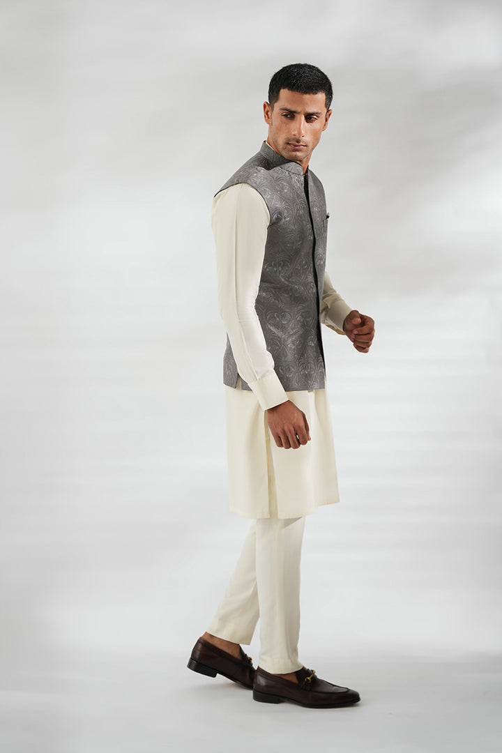 This ensemble pairs a crisp ivory boski kurta set with a tailored waistcoat in slate grey pure raw silk. The waistcoat, adorned with a subtle tonal print and a contrasting pocket square, lends depth and texture without overpowering the clean silhouette. The look achieves a refined balance of modern polish and timeless tradition.