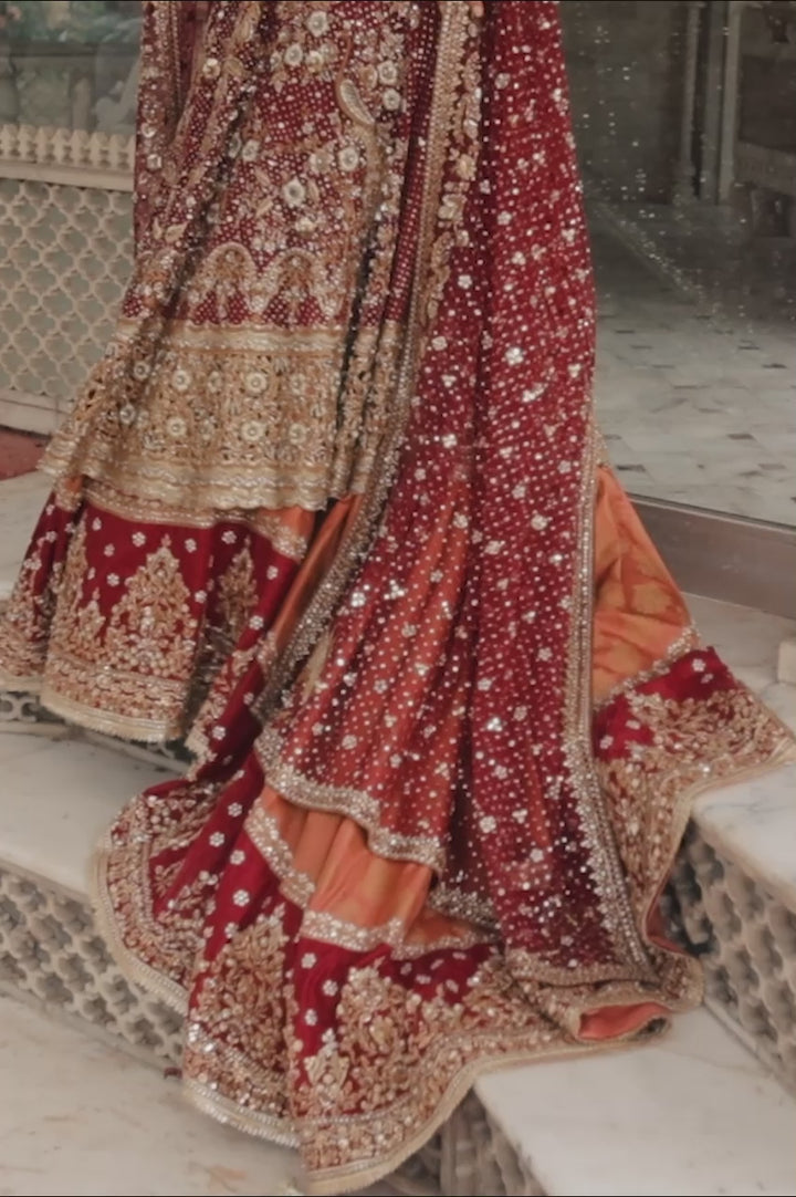 This off shoulder crimson net peshwas bridal ensemble is a dream-worthy ode to all that is romantic and ethereal. Shades of reds and gold sparkle through zardoze, sequin and crystal work. The brocade farshi lehnga speaks to times bygone with the complementing tangerine shade pattern and worked border. The heavily worked net dupatta has big embellished birds that completes the bridal ensemble to perfection.