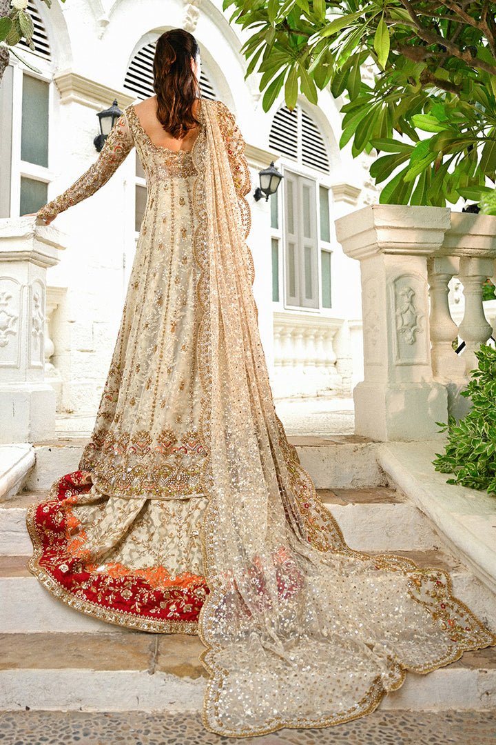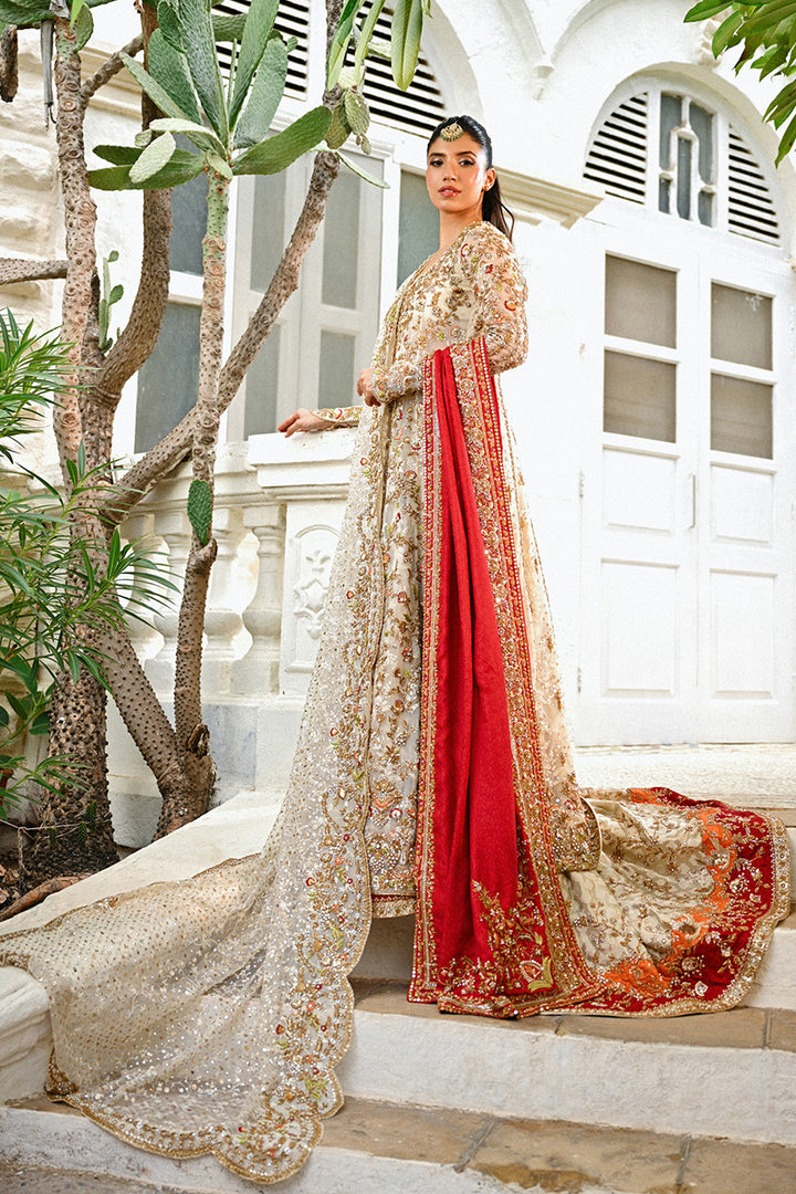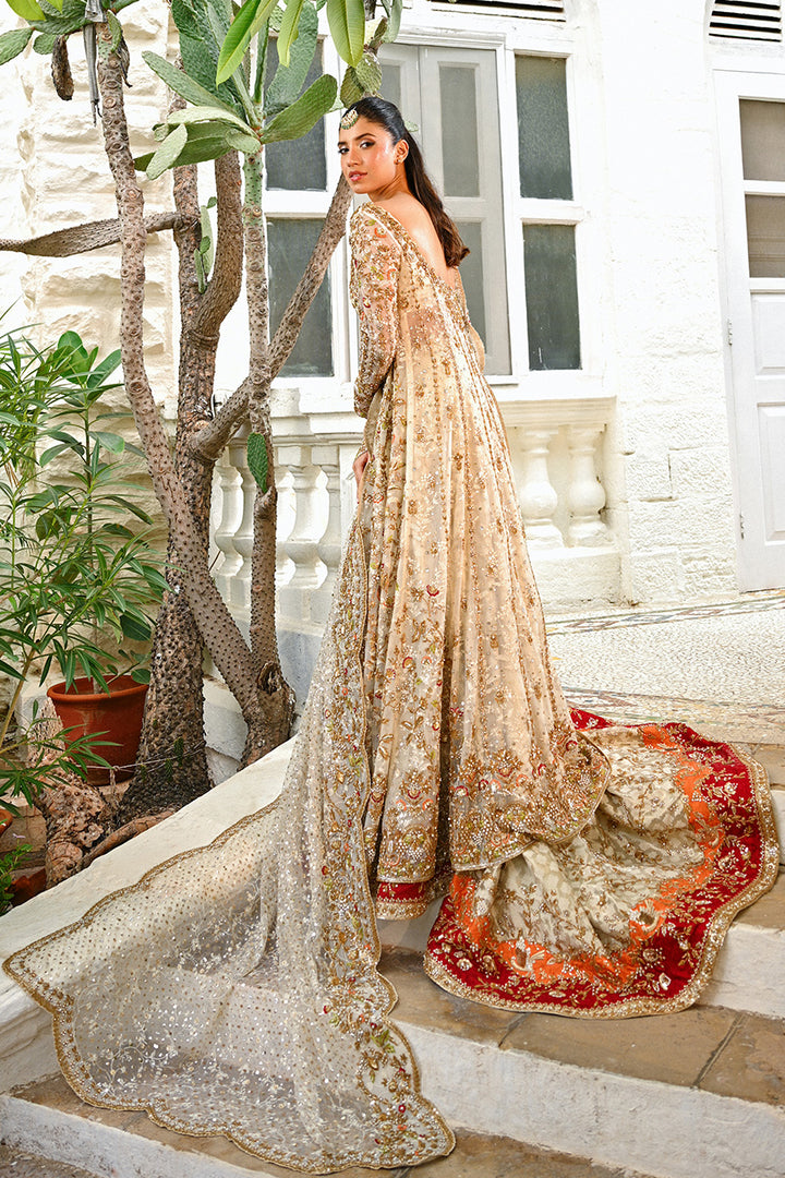 Delivery 4-6 MonthsThis bridal ensemble is imagined on a soft ivory base, lavishly worked with resham, sequins, pearls, and zardoze in gold with pops of colour. The French tulle peshwas flow in a grand silhouette, its panels alive with intricate embroidery that extends into a voluminous lehenga beneath, layered over a pure raw silk tube top. The matching brocade lehenga is finished with striking chatapatti borders that lend depth, dimension, and traditional artistry to the look. It is styled with a diaphanous French tulle dupatta encrusted with crystals and scalloped borders, paired with a richly embroidered crimson shawl crafted from self-jamawar and detailed with gold thread and ornate edging.