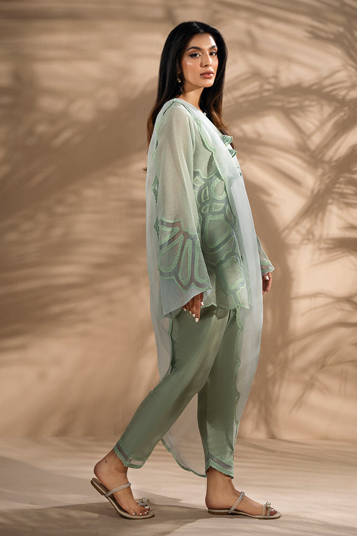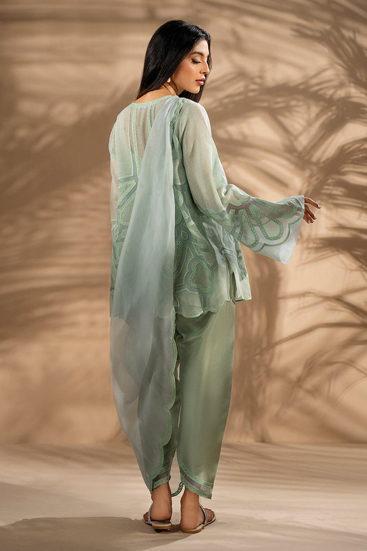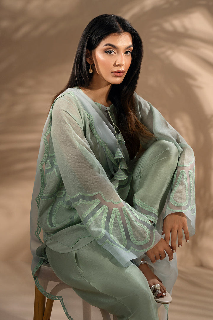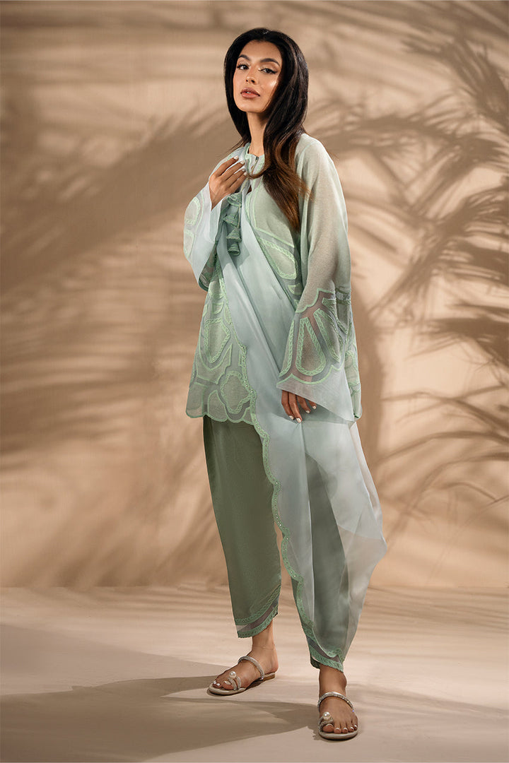 In misty blue and mint, the khaddi corduroy shirt is cut in a relaxed silhouette, its surface traced with aari embroidery and organza inserts that elevate the front and sleeves with delicate artistry. Layered textures reveal soft transparency in the matching pre draped organza dupatta. Paired with tapered pure rawsilk shalwar finished with tonal organza inserts at the hem, the ensemble carries the grace of sheer craft with effortless charm.