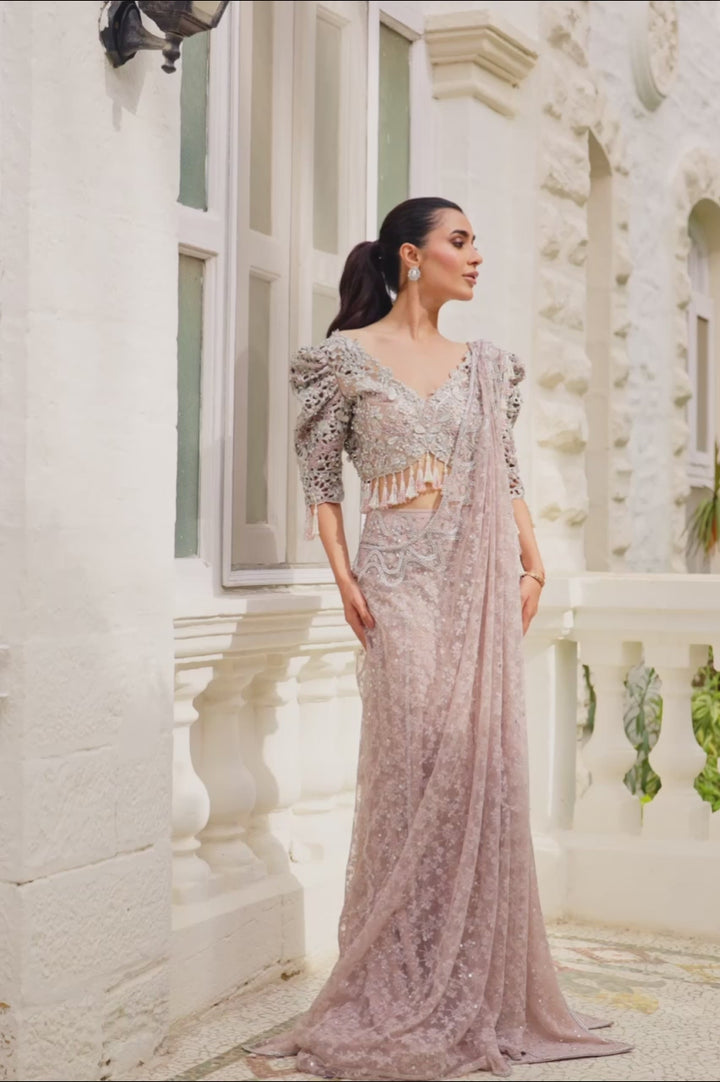 An ethereal saree in muted lilac, draped in diaphanous French tulle, dusted with sequins and tonal embroidery, and finished with pearl tassels. The sculpted tissue blouse stuns with opulent cutwork, zardoze embellishment, and dramatic puffed sleeves that cascade into a fringe of beaded drops. Paired with a pre-draped French tulle dupatta gathered on one shoulder and edged with bead tassels, the ensemble whispers haute couture elegance with a modern, sculptural edge.