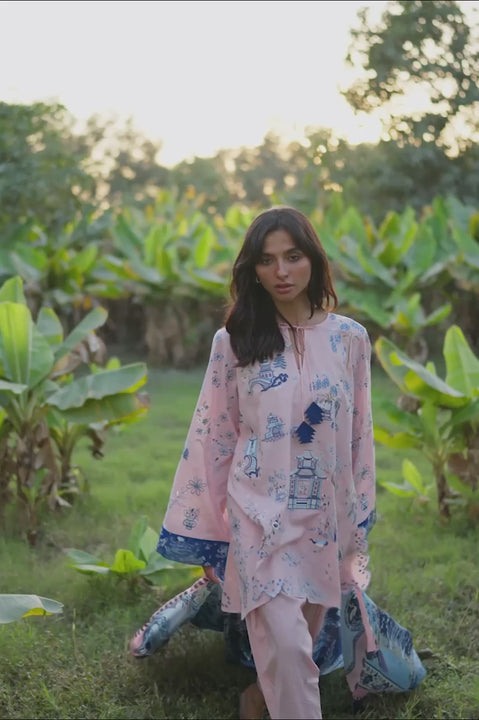 Echoing the charm of a pastoral landscape, a pastel pink jacquard lawn shirt is adorned with toile inspired scenic embroidery in shades of cornflower and soft navy, depicting architectural and pastoral motifs in a balanced composition. Contrasting cerulean cuffs lend definition to the silhouette. The ensemble is paired with a matching jacquard cotton shalwar, finished with embellished scalloped hem. A statement medium silk dupatta in layered tones of deep navy, aqua, and lilac completes the look with an intricate scenic and botanical print.