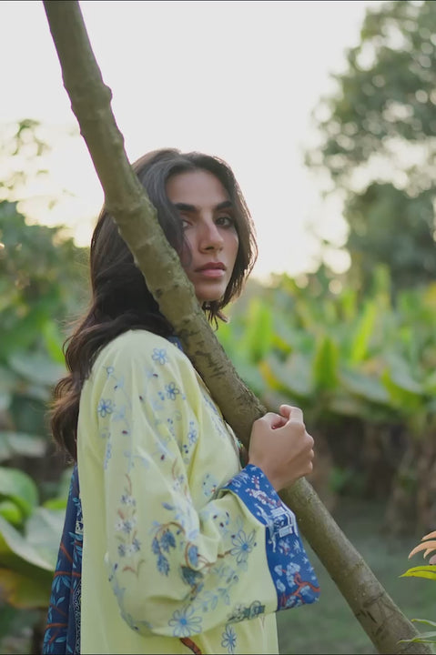 Echoing the charm of a pastoral landscape, a pale butter yellow jacquard lawn shirt is adorned with toile inspired scenic embroidery in shades of cornflower blue and soft navy, depicting architectural and pastoral motifs in a balanced composition. Contrasting navy cuffs lend definition to the silhouette. The ensemble is paired with matching jacquard cotton culottes, finished with embellished scalloped hem. A statement medium silk dupatta in layered tones of deep navy, aqua, and butter yellow completes the look with an intricate scenic and botanical print.
