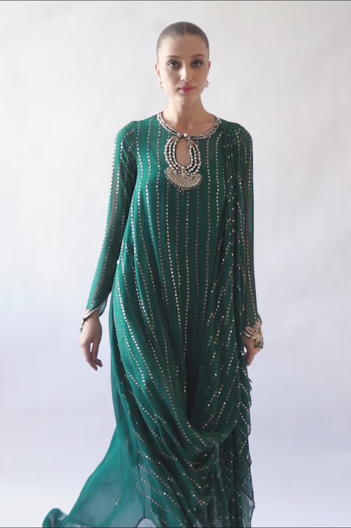 An emerald georgette long shirt with a draped dupatta is handworked with delicate kamdani. The sleeves and neckline are detailed with jewelled floral motifs. An elegant ensemble for any formal event or soiree.