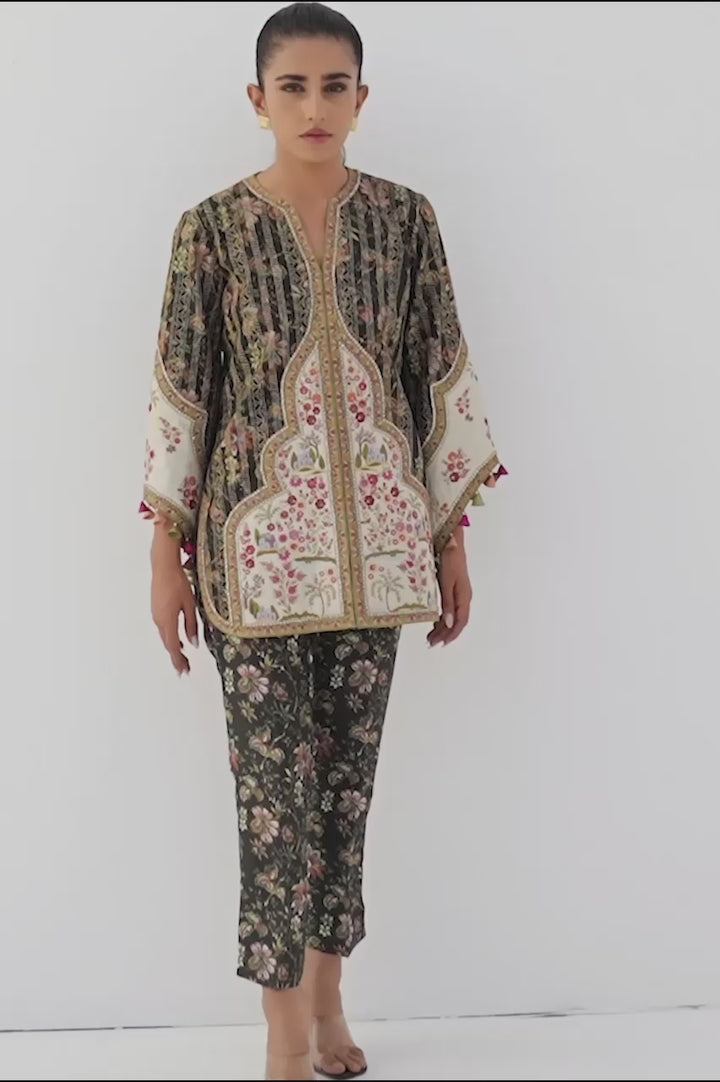 Opt for this luxurious khaddi silk jacket featuring silk appliques and elaborate handwork along the neckline, hemline, and tassel detailings along the sleeve cuffs. Paired with our printed raw silk pants will make you the center of attention