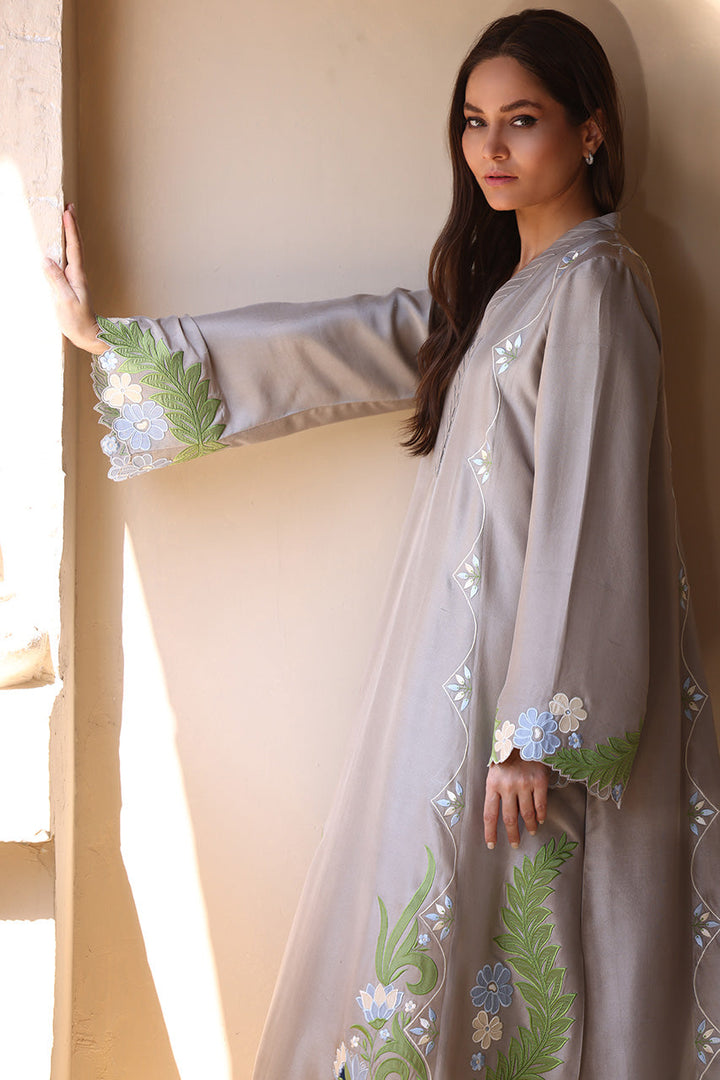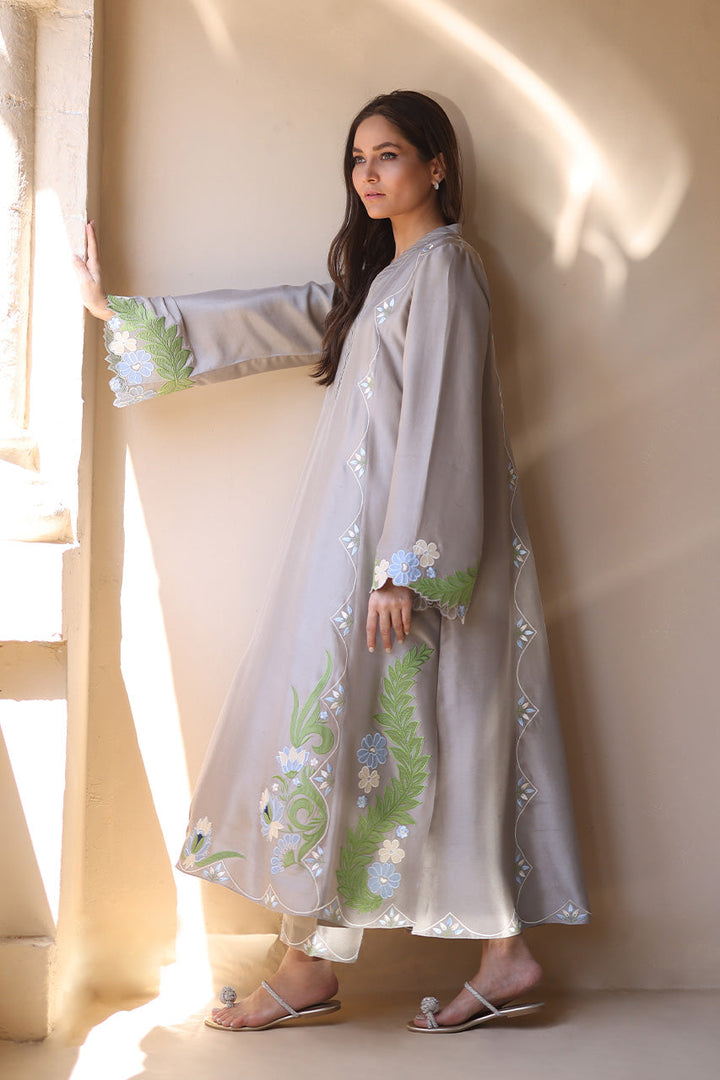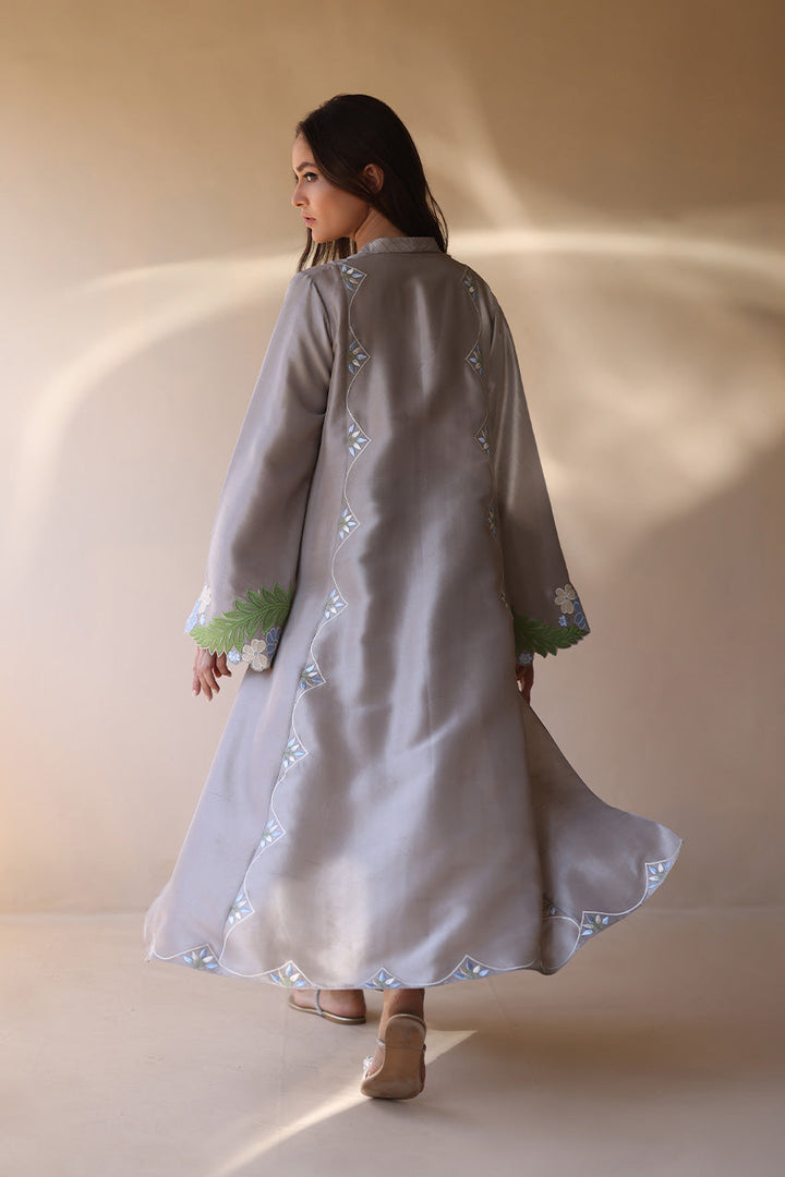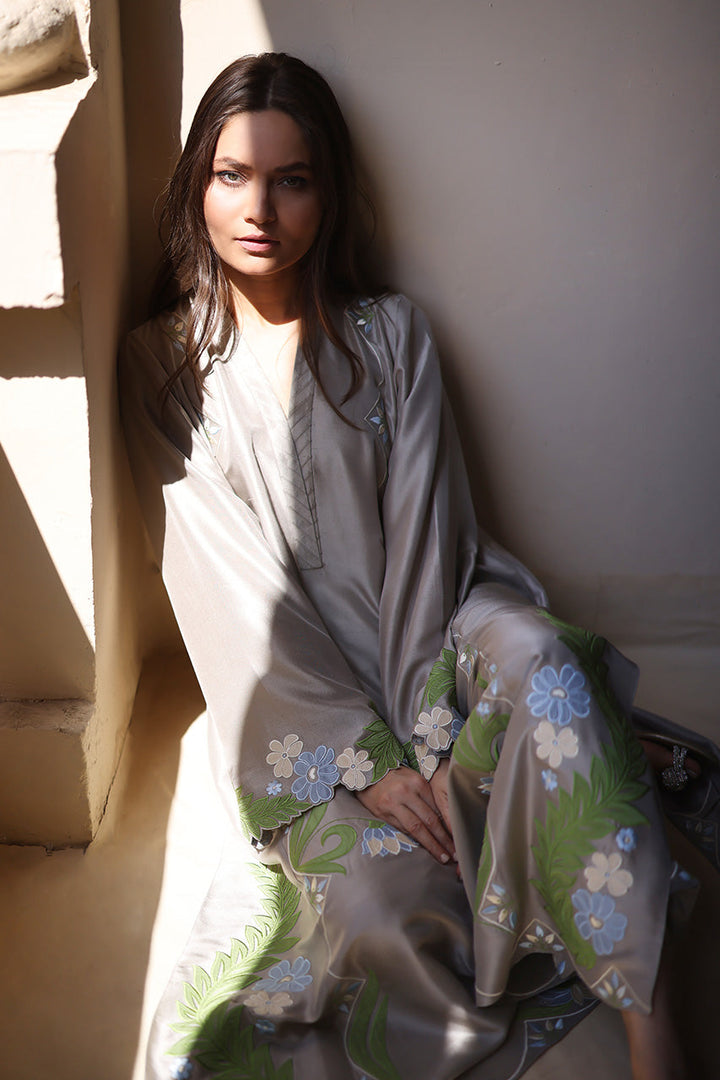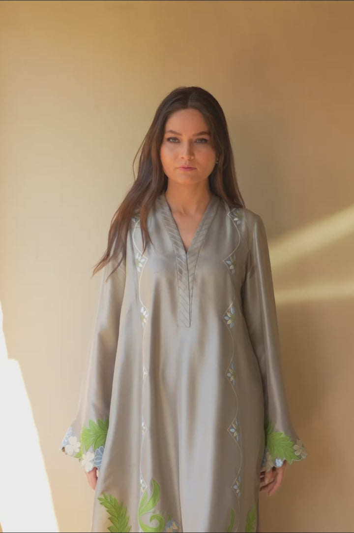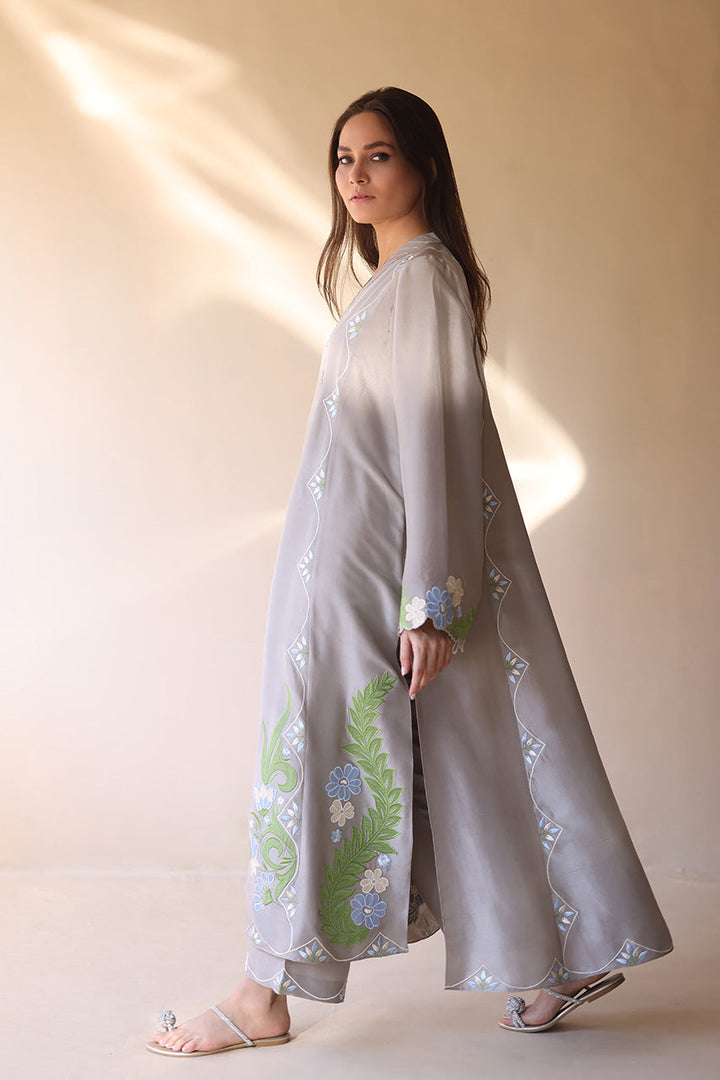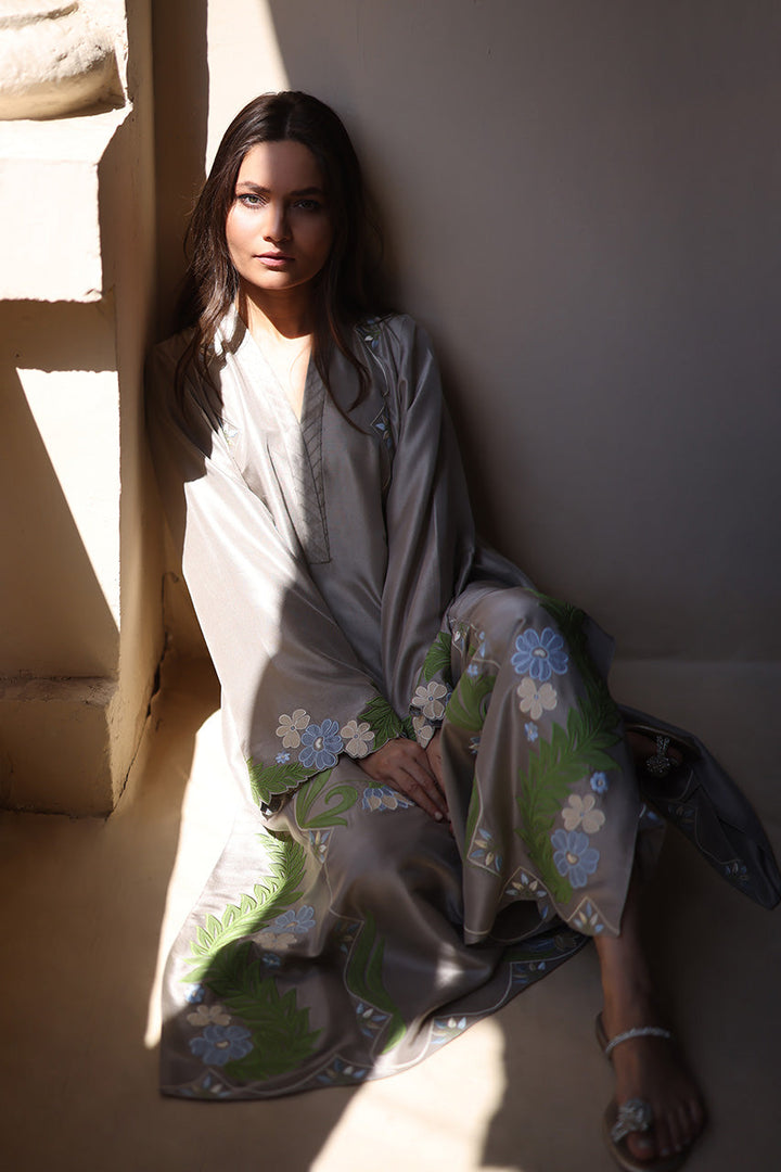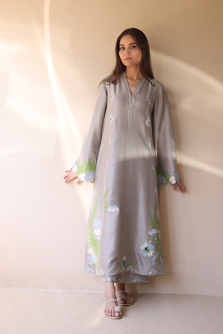 Inspired by an enchanting forest, a pure raw silk A-line shirt in a taupe hue has contrasting applique embroidery that amplifies the splendor. Paired with matching pure raw silk culottes with applique accents.