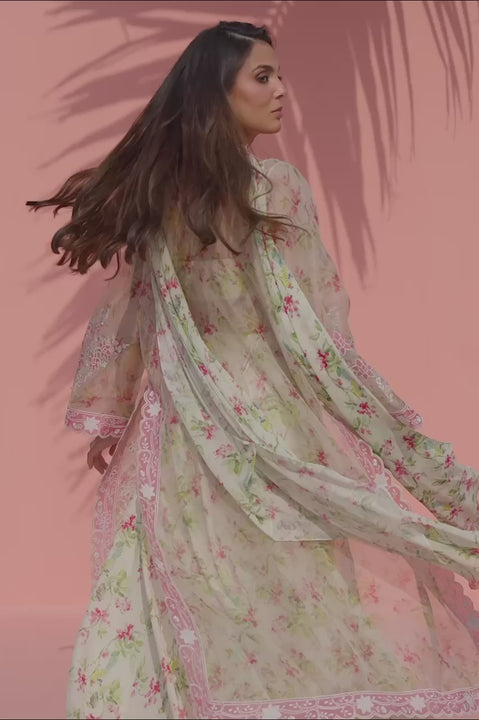 This airy ensemble is defined by a delicate floral print set against a soft cream base. The long organza shirt is layered over a matching khaddi silk tube top and accented with embroidered detailing along the neckline, cuffs, and hem, adding subtle structure to the silhouette. A coordinating printed georgette choker dupatta drapes effortlessly, while flowing khaddi silk dhaka pajamas complete the look with a romantic, refined finish.