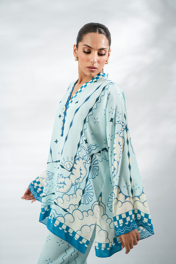 A serene crepe ensemble in soft sky blue and ivory. The relaxed silhouette features a delicate print inspired by architectural forms and fluid geometry, framed with scalloped borders and checker detailing along the neckline, sleeves, and hems. Paired with matching culottes that echo the intricate patterning for a harmonious finish.