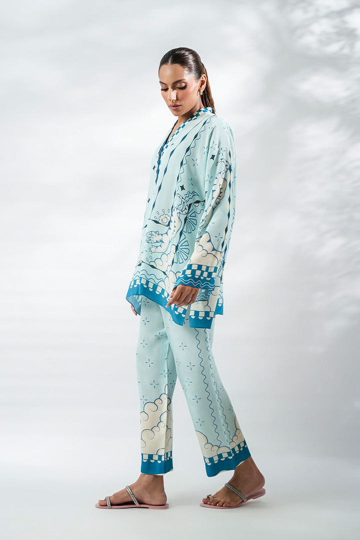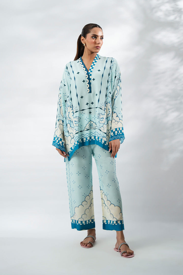 A serene crepe ensemble in soft sky blue and ivory. The relaxed silhouette features a delicate print inspired by architectural forms and fluid geometry, framed with scalloped borders and checker detailing along the neckline, sleeves, and hems. Paired with matching culottes that echo the intricate patterning for a harmonious finish.