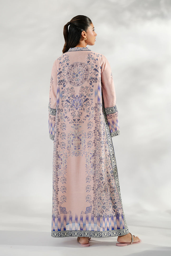 A serene blush hued kaftan, brought to life with delicate azure florals...