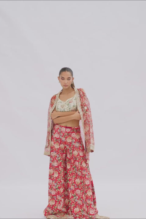 In rich tones of burnt orange and earthy hues, this ensemble combines tradition with contemporary ease. The sheer organza jacket, patterned with painterly florals, is edged with intricate gota and mirror embroidery that frames the neckline, cuffs and borders. It is paired with a fully embellished printed khaddi silk tube top, while a khaddi silk dhaka pajama carries the same botanical print, its borders richly adorned with embellishment for an effortless yet resplendent finish.