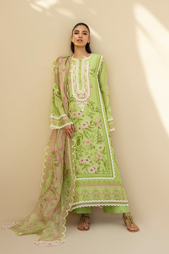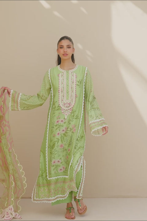 Exuding timeless elegance, this pistachio hued cotton net shirt is adorned with delicate aari embroidery along the neckline and intricate oriental motifs in soft cream and sage tones. Paired with a pistachio flowing organza dupatta, featuring muted orchid toned swirls and verdant accents, framed by scalloped aari embroidery along all four corners. Each corner is elevated with a hand embroidered bouquet of petals, adding a touch of artisanal sophistication. The ensemble is completed with matching pure raw silk culottes for a look that is both graceful and refined.