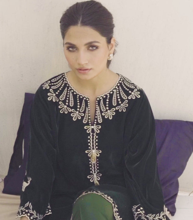 Elegant and sophisticated this deep shade of emerald is cut from the softest velvet the kurta is finished with scalloped edges and modern detailing. The matching raw silk trousers follow through with the attention to detailing on the cuffs.