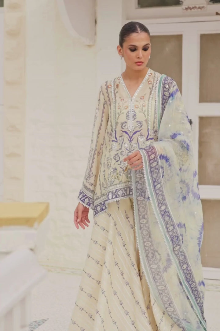 This festive ensemble radiates sophistication in a delicate palette of ivory, indigo, and muted teal. The cotton net kurta is intricately embellished with shimmering gota embroidery in floral and vine motifs, layered over a matching pure rawsilk tube top for a contemporary touch. It is paired with a voluminous khaddi silk gharara, expertly tailored and accented with fine vertical gota detailing and a contrasting border.. A gossamer organza dupatta, printed in a soft watercolor blend of complementary hues, completes the look with effortless grace.