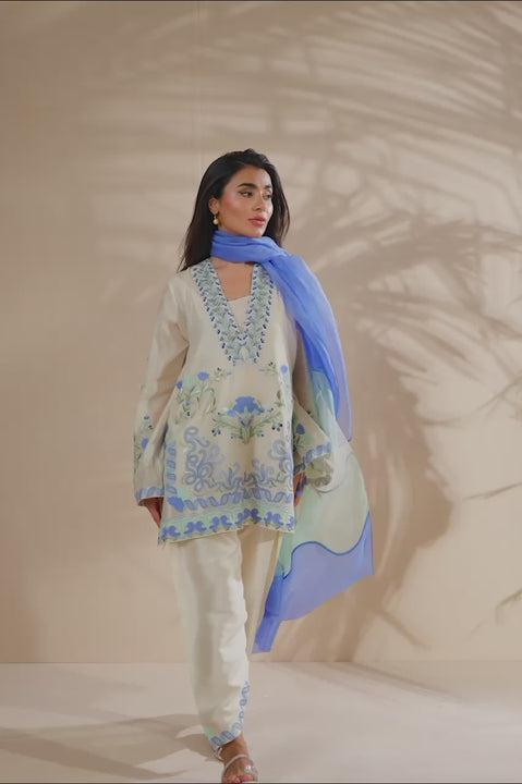 A refined ensemble that exudes timeless elegance, this ivory hued khaddi corduroy shirt is adorned with delicate floral embroidery in cerulean, mint, and jade tones. The intricately detailed neckline and hem showcase artisanal craftsmanship through appliqué detailing and resham embroidery. Paired with sleek, softly tailored pure raw silk shalwar, the look is completed with a sheer organza dupatta composed of wavy panels in mint, ivory, and azure, lending a soft, contemporary finish.