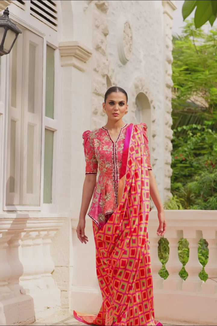 This three piece set unfolds on a tangerine canvas, alive with vivid florals reminiscent of a painted garden. An A line cotton net kurta flows with ivory scalloped accents, a dramatic side slit and an embroidered neckline, while scalloped cuffs frame the sleeves. Wide palazzos in matching cotton net echo the motif in quiet harmony. A fluid medium silk dupatta, shaded in ombre tones and scattered with jewel toned vines and blossoms, completes the look in a symphony of colour and craft.