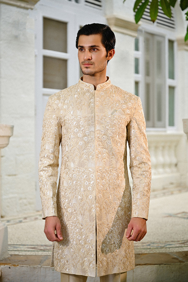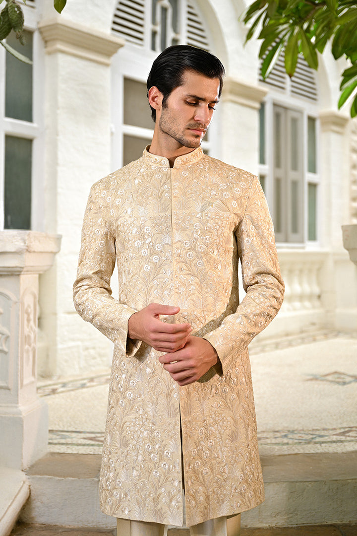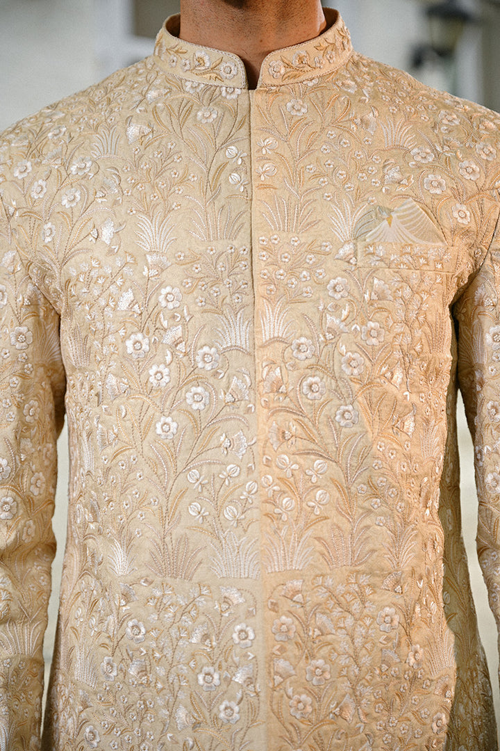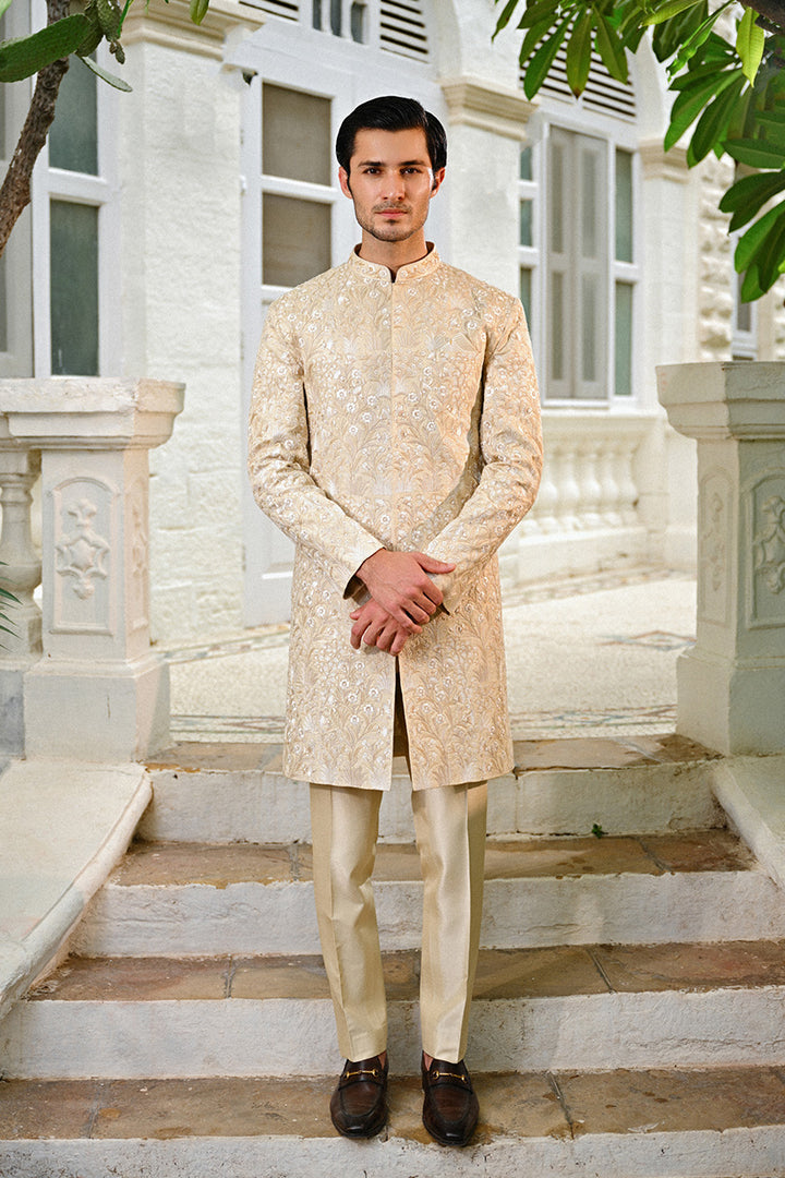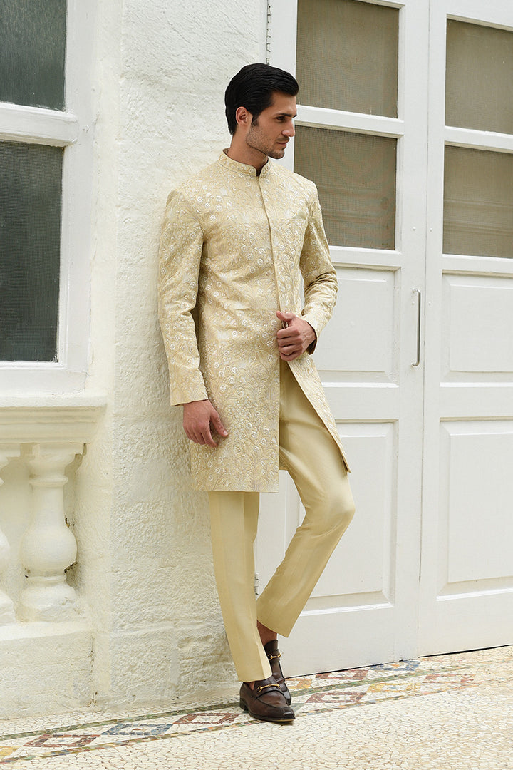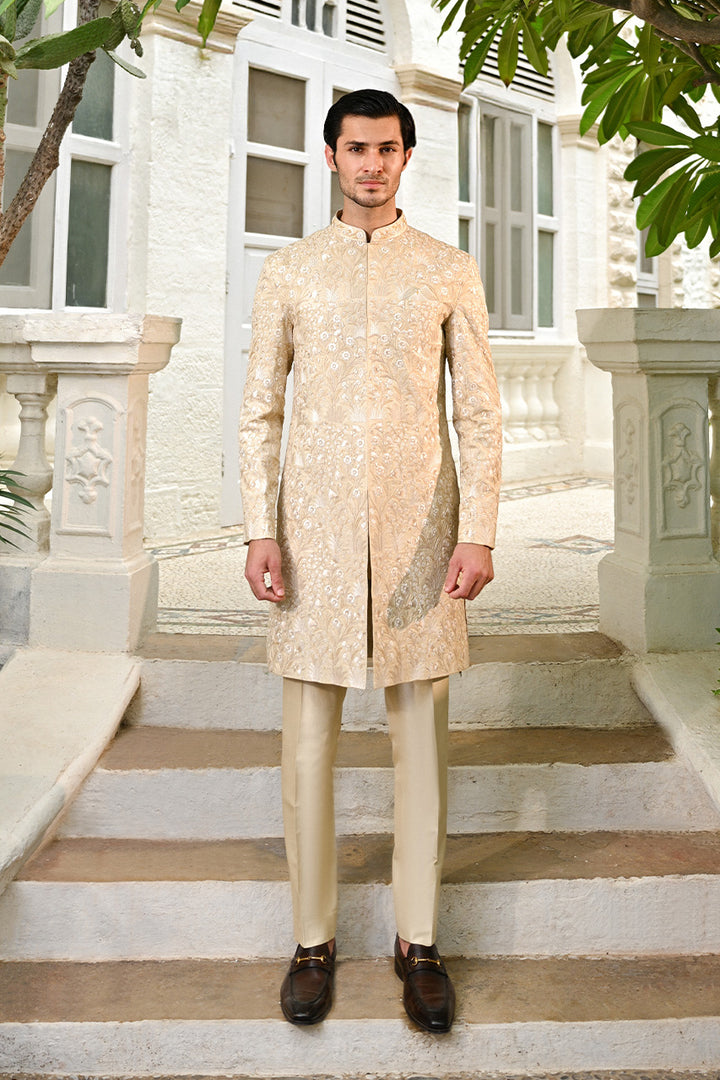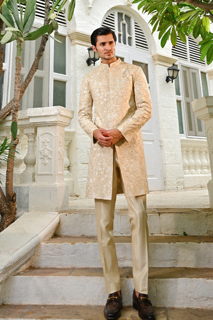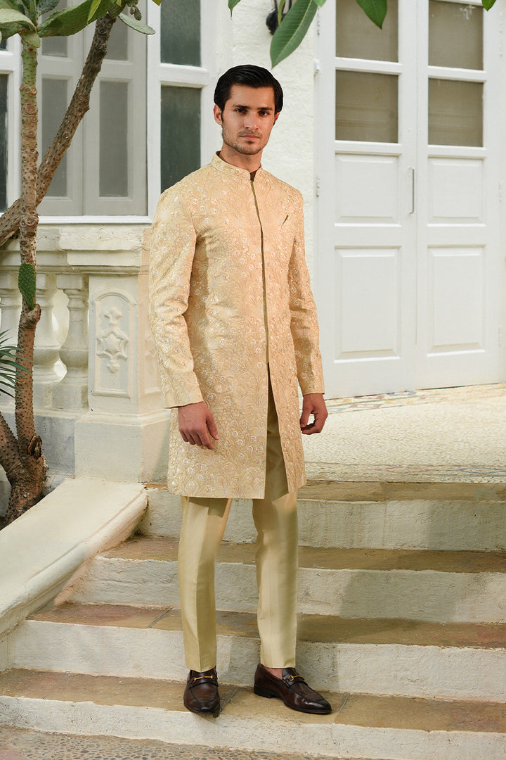 A stately sherwani in mellow champagne self jamawar, woven with a lattice of aari threadwork and tonal florals that exude quiet grace. The long, streamlined silhouette with a concealed placket balances ornate craft with modern restraint. Paired with pure raw silk pants, the ensemble embodies poised grandeur.