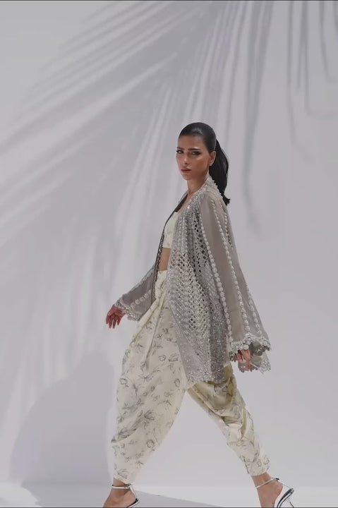 Delivery 8-9 WeeksAn ethereal play of shimmer and shadow, this look captures quiet regality in silvery tones that glisten like moonlight through mist. The platinum toned organza jacket is exquisitely hand-embroidered with intricate threadwork and sequined cutwork, finished with scalloped borders that gracefully frame the silhouette. Sheer sleeves traced with tonal floral embroidery lend a sense of lightness and fluidity. Worn over a painterly printed cream charmeuse bustier, the look is completed with billowing printed charmeuse shalwar in matching tones, adorned with fine botanical sketches that evoke a touch of vintage poetry.