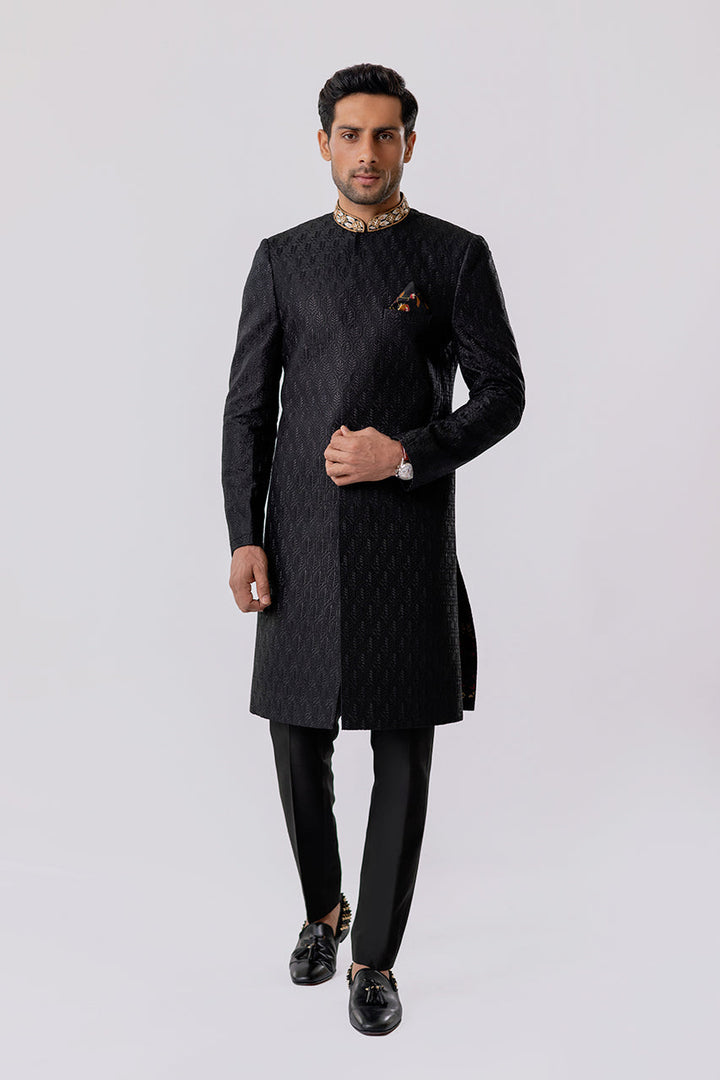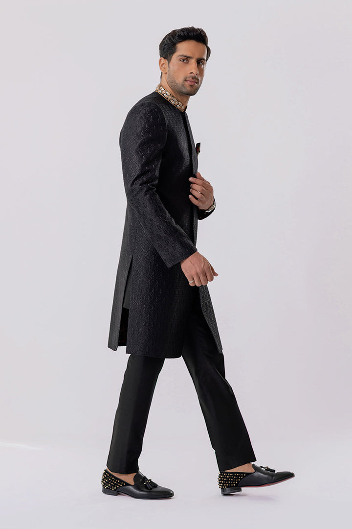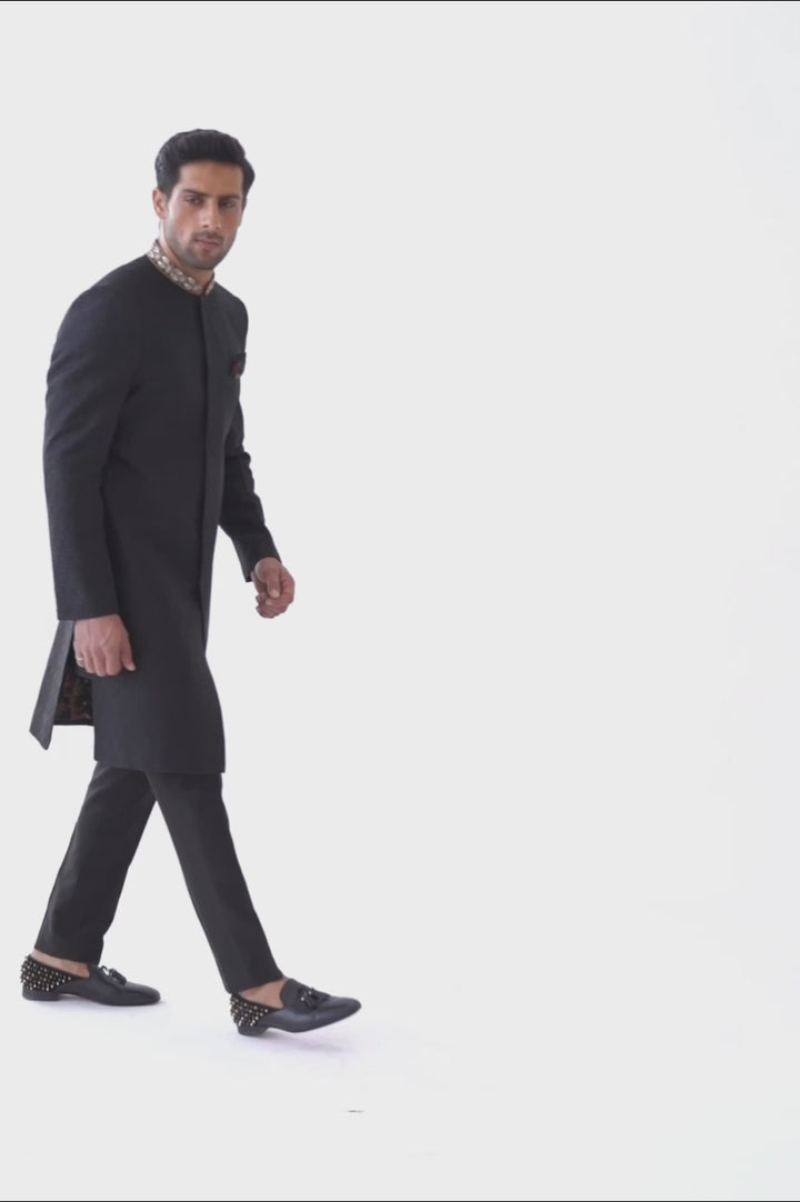 A charcoal raw silk sherwani with an overall embroidered pattern is enhanced with a worked collar and lined with a quintessential SM print in medium silk. The look is completed with matching raw silk trousers.