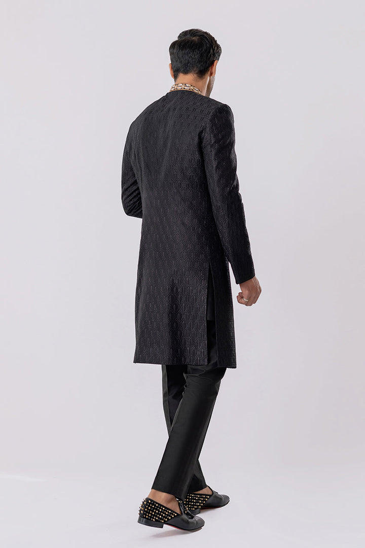 A charcoal raw silk sherwani with an overall embroidered pattern is enhanced...