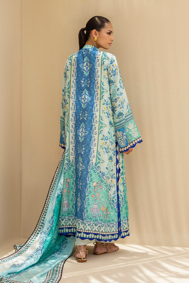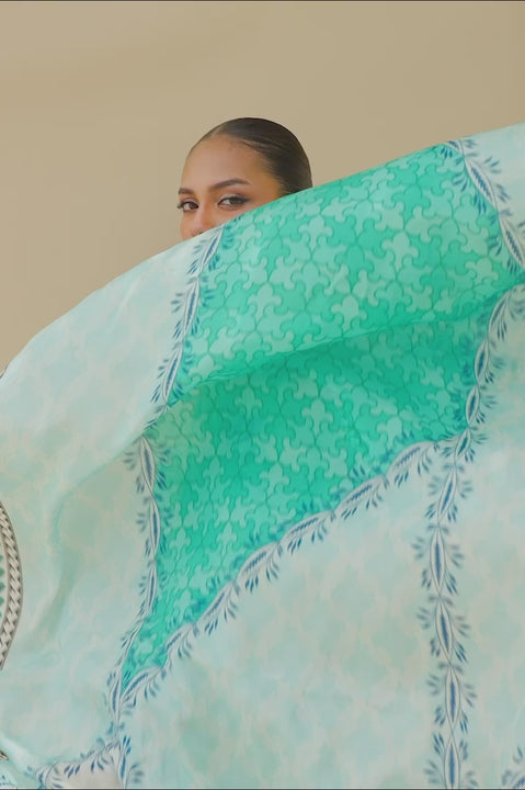 An ensemble that channels Mediterranean ease through a breezy palette of azure, ivory and seafoam, accented with deep cobalt. Crafted from khaddi silk, the shirt is adorned with intricate linear and floral patterns that cascade along its length. Subtle tassel ties at the neckline add fluidity, while scalloped edging on the sleeves, front, and hem creates a softly dimensional finish. Paired with a printed medium silk dupatta in oceanic hues and ivory toned pure rawsilk culottes.