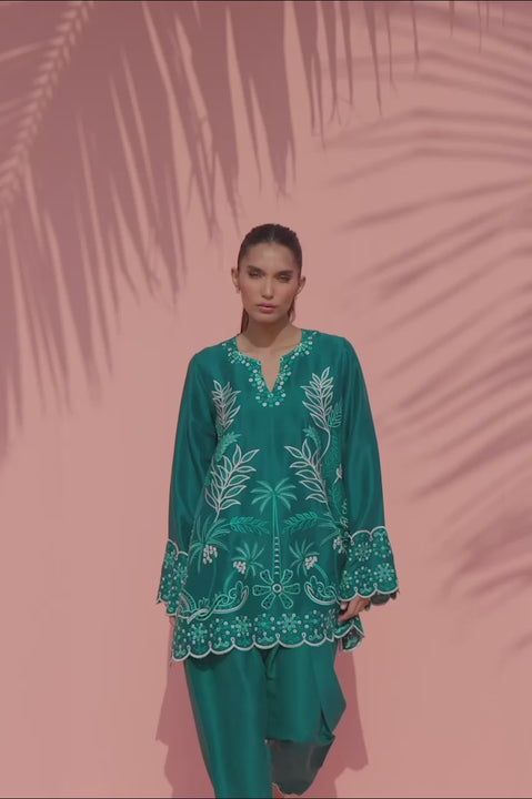 Rendered in a rich teal tone, this look is defined by intricate eyelet embroidery and an easy, relaxed structure. The pure rawsilk shirt is cut in a loose silhouette with wide sleeves and a clean V neckline. Stylised botanical and ornamental motifs unfold across the surface in tonal embroidery, while scalloped eyelet detailing frames the hem and cuffs. It is paired with a pure rawsilk tapered shalwar in a matching tone, finished with scalloped edging at the hem for a clean, polished finish.
