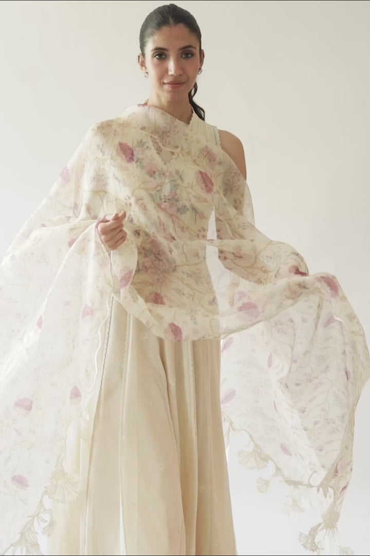 An ivory peshwas cut from cotton net in a flattering silhouette is delicately embroidered with blush pink and pastel blue florals. A wide embroidered border and lace details edge the peshwaas in style. A floral printed organza dupatta with a unique cutworked edging is paired with the ensemble.