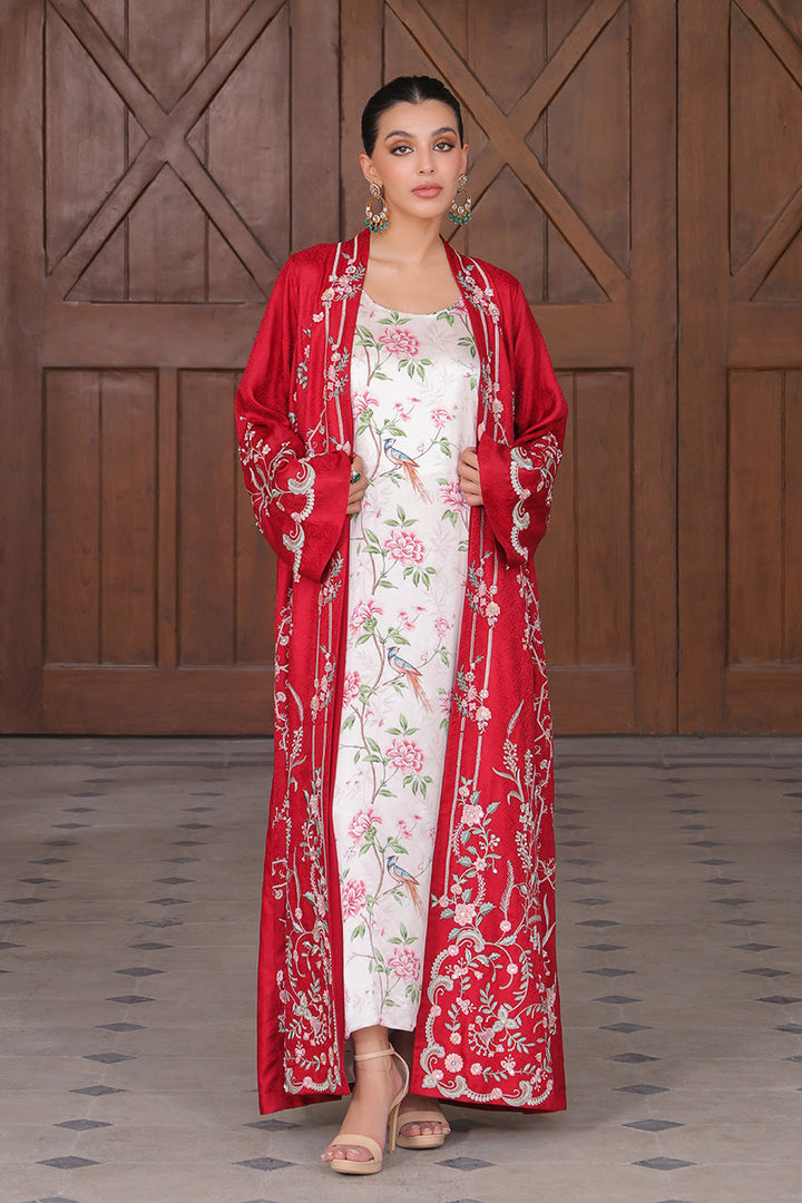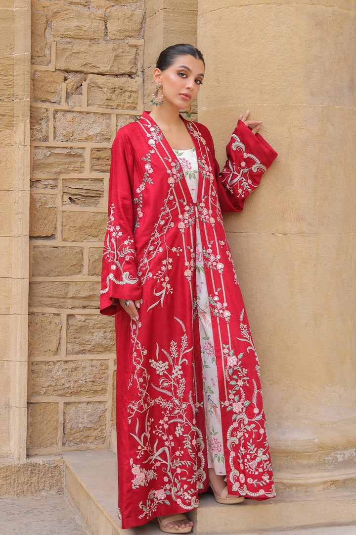 Bathed in deep crimson, this flowing front open kalidaar jacket in self jamawar is adorned with delicate embroidery in ivory, sage, and blush, flowing into a garden of florals. Beneath, a painterly printed crepe slip dress reveals soft botanical motifs, allowing the silhouette to move with uninterrupted grace.