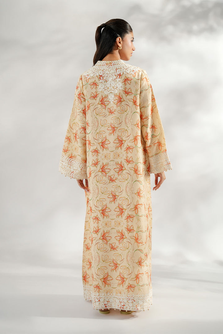 Cut from khaddi silk, this kaftan blooms with florals in burnt tangerine and soft sage against a champagne peach canvas. The flowing silhouette is framed with ivory aari embroidery along the neckline, where printed vines and blossoms cascade gracefully down the placket. Wide sleeves close with embroidered borders, while the hem is anchored in intricate needlework, creating a piece that embodies effortless grace.