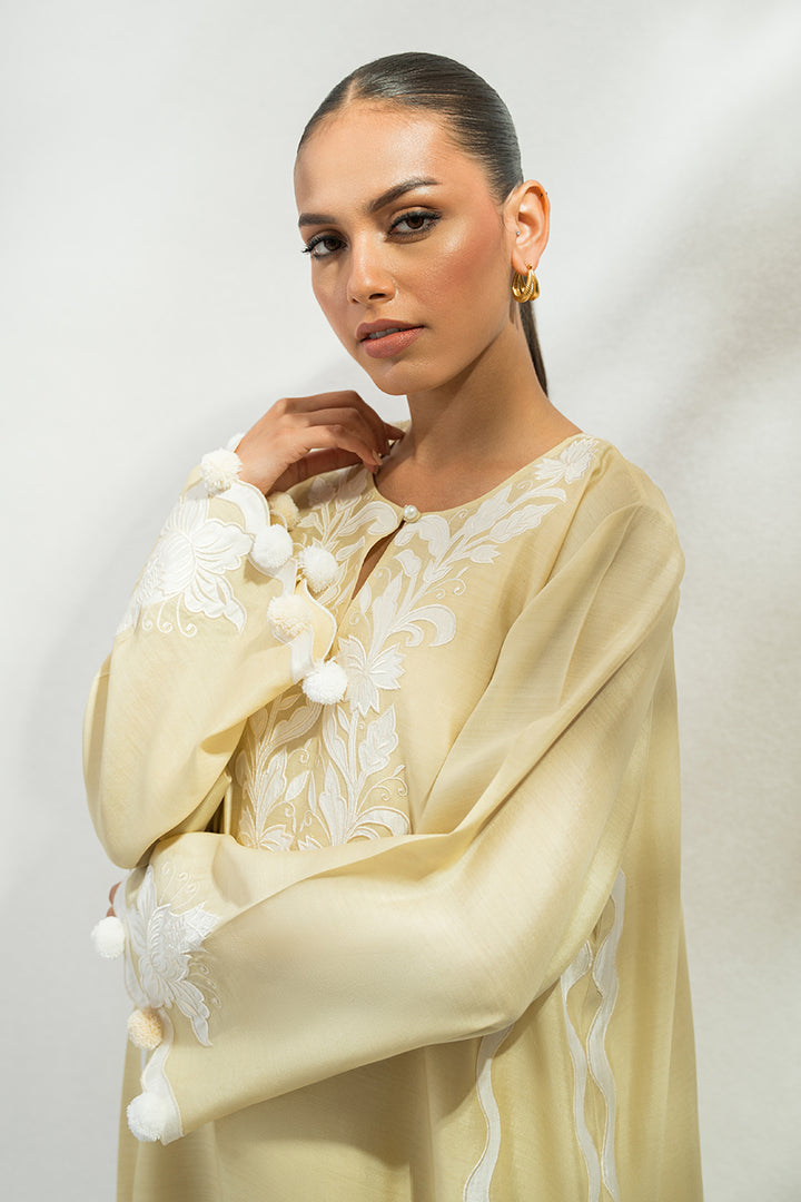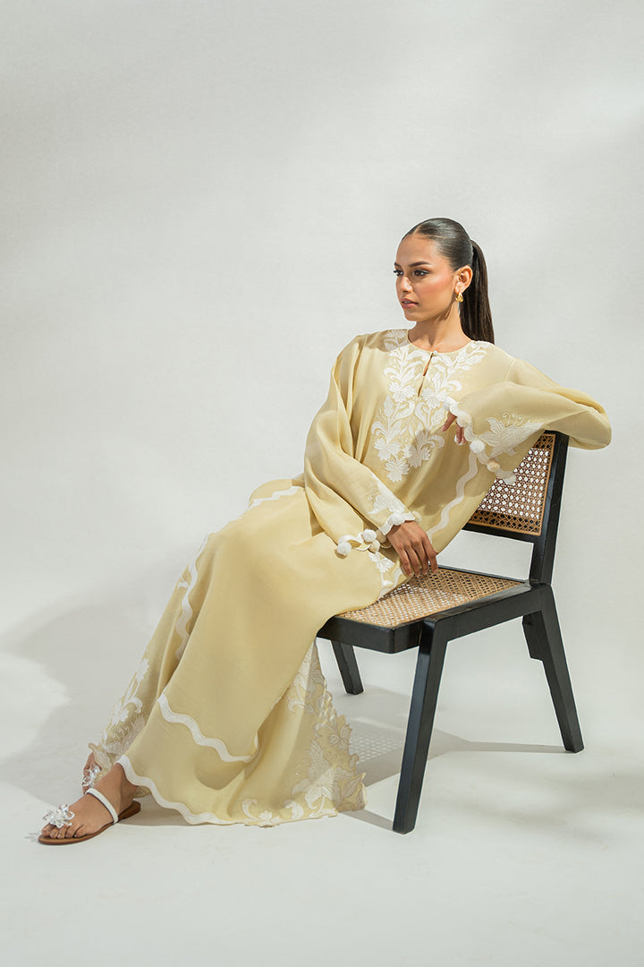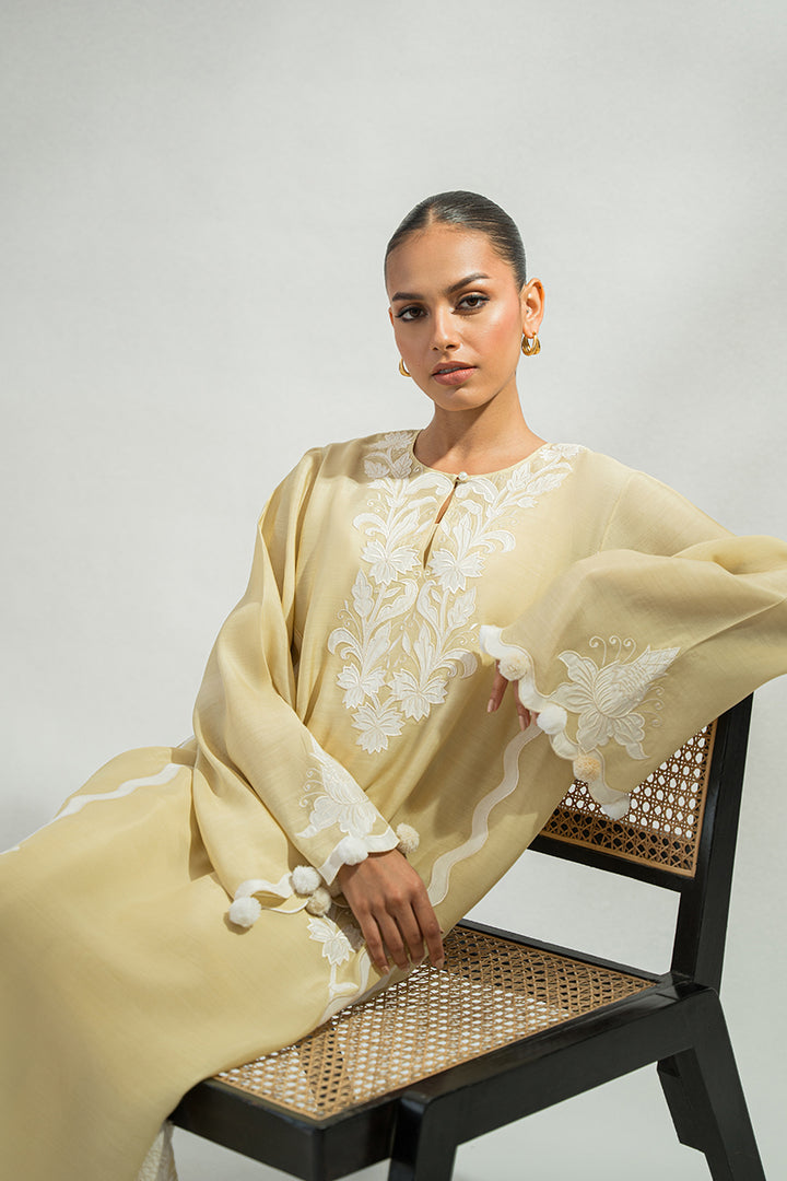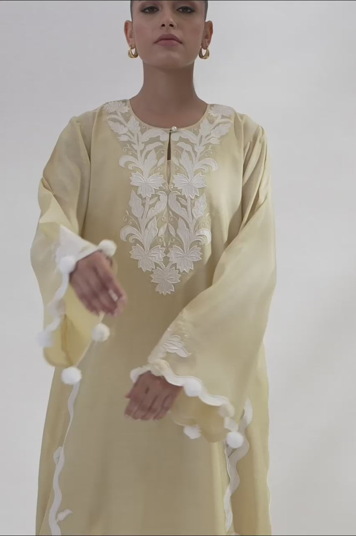 "A pale yellow kaftan cut from khaddi silk is adorned with floral appliqué all over. The look is complemented with playful pompom details and scalloped edges.