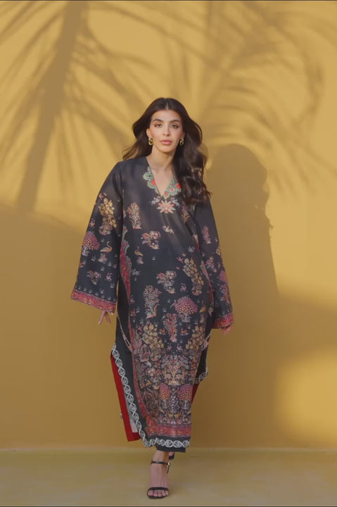 A long shirt creates a striking silhouette in a deep ebony hue. Crafted from pure raw silk, the fabric unfolds a rich tapestry of burnt orange, saffron, and crimson shades. The V-neckline introduces a narrative of wildlife motifs, while the wide, flowing sleeves are finished with a bold, burnt orange contrasting border. Defined by its fluid movement and maximalist pattern, this ensemble epitomizes opulent elegance.