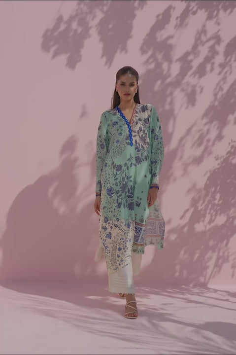 A relaxed crepe shirt in soft mint and ivory tones is brought to life with intricate botanical motifs in deep blue. The silhouette features fluid lines and wide sleeves, accented with contrasting scalloped borders and a patterned neckline for subtle definition. Finished with a statement printed hem panel, the design balances ease with visual depth. Paired with classic ivory pure rawsilk culottes detailed with soft pleats, the look feels effortlessly composed.