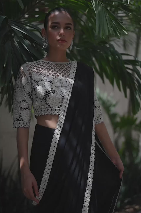 This charcoal coloured pant-sari is cut from crepe paired with a khaddi silk blouse with a cutworked neckline, 3D embroidered flowers and beaded embellishment that adds sparkle. The lace finishing adds texture to the outfit, creating subtle yet impactful details.