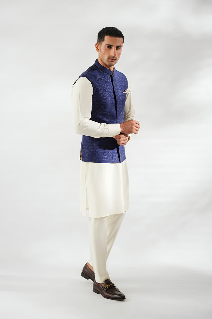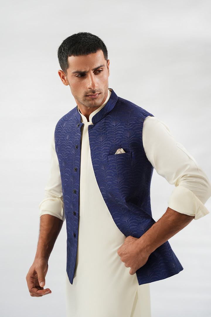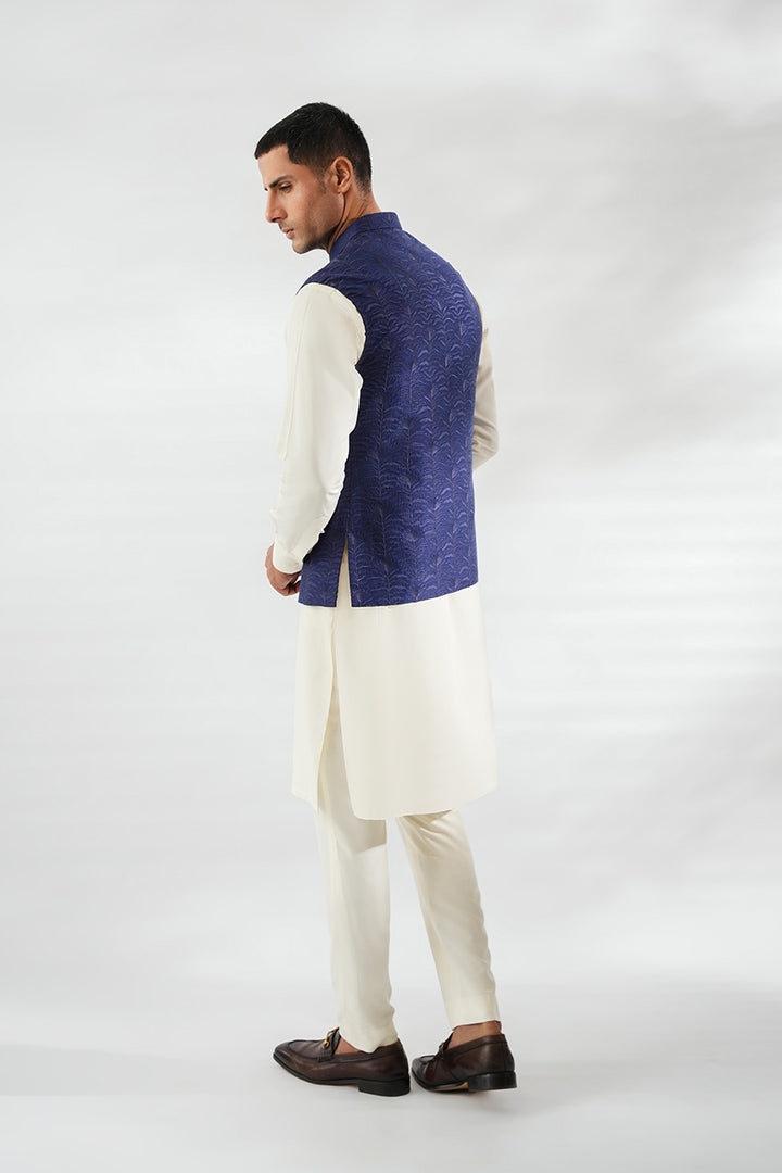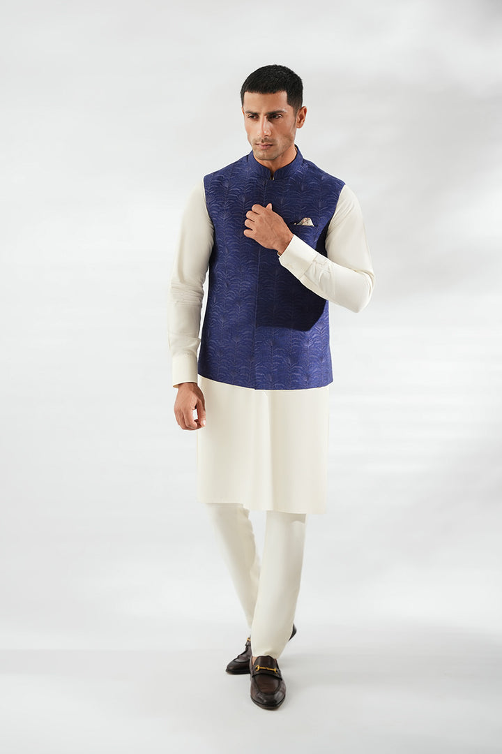 An ivory-hued boski kurta with matching pants is paired with a navy pure rawsilk waistcoat, embroidered with repeated floral motifs that lend refined texture to the silhouette. A neatly folded ivory pocket square completes the look with understated elegance.
