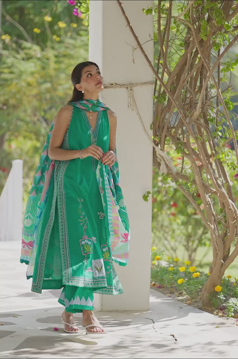 Inspired by the depth of a lush forest, a deep green jacquard lawn shirt is adorned with soft ivory and blush floral bouquet embroidery along the hemline. Tropical foliage embroidery traces the neckline and extends gently along the sides, framing the silhouette. Postcard inspired appliqué details accent the hem with a playful narrative touch. Matching jacquard lawn culottes complete the look, finished with powder blue leaf appliqué at the hem. A statement dupatta in layered emerald, aqua, and soft rose tones carries geometric and botanical motifs, lending a rich finish.