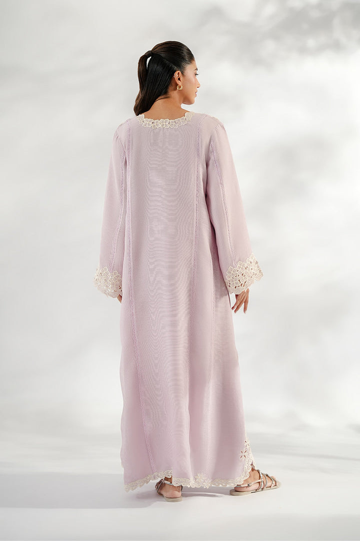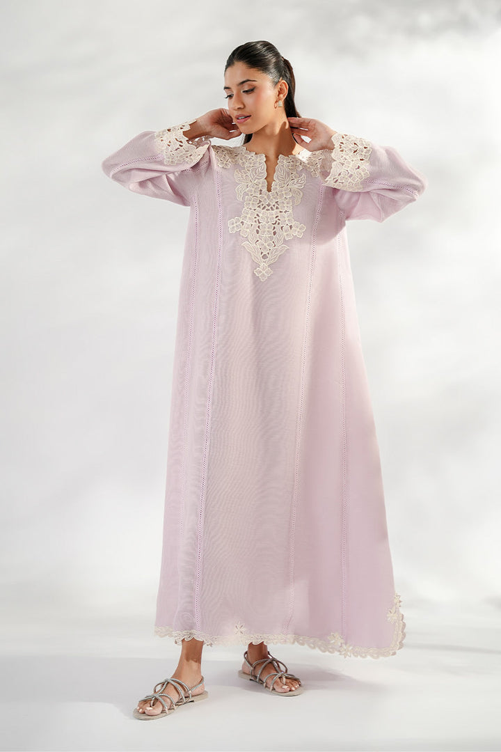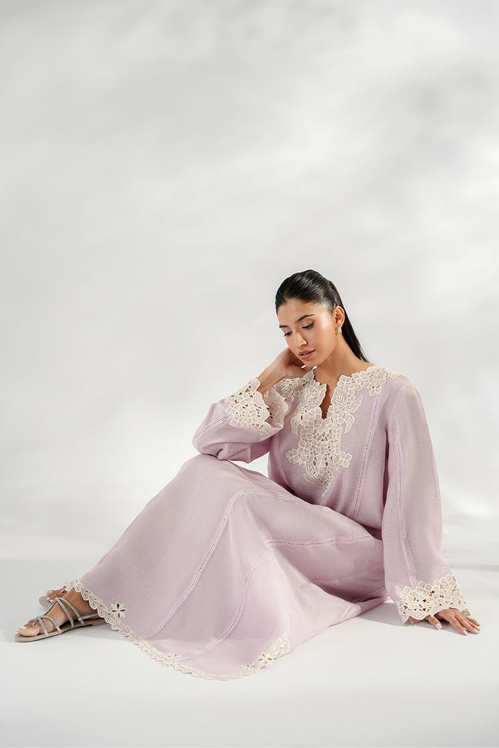 Rendered in a delicate whisper of lilac, this breezy khaddi corduroy kaftan is adorned with intricate ivory hued cutwork embroidery along the neckline, cuffs, and hem, exuding effortless sophistication. The split neckline redefines minimal elegance.