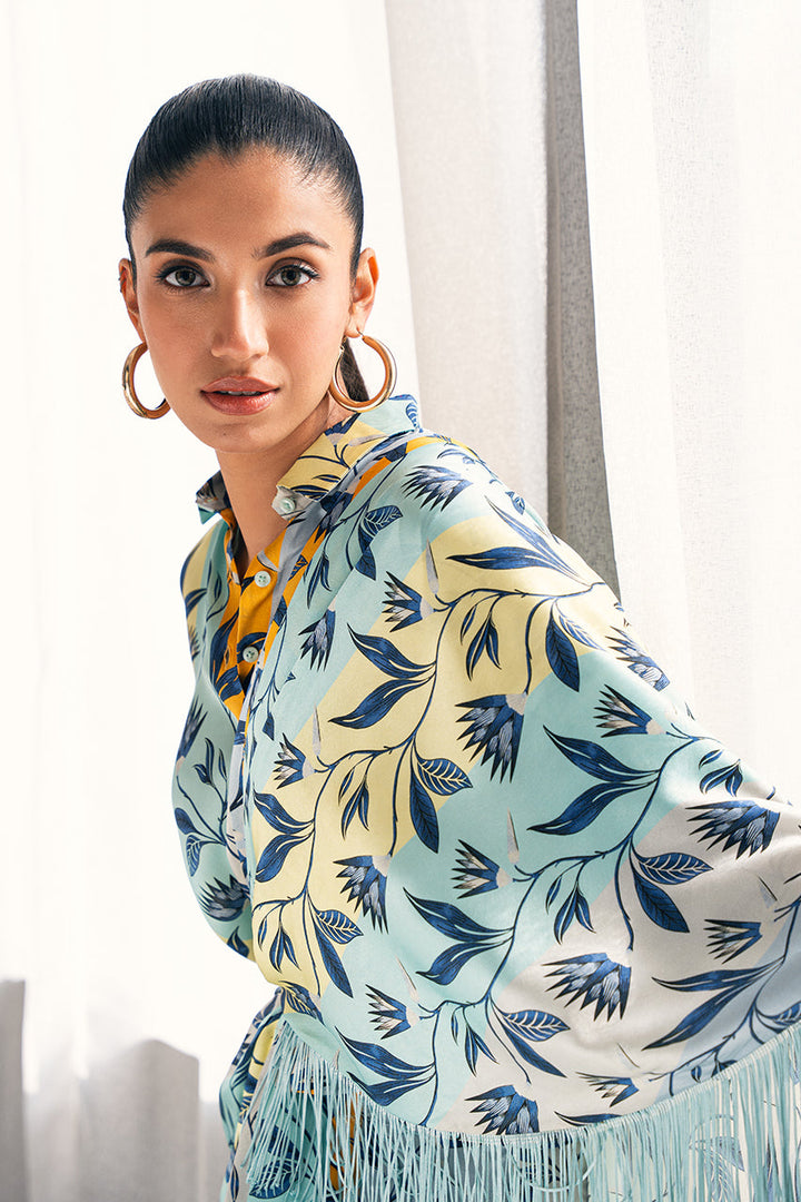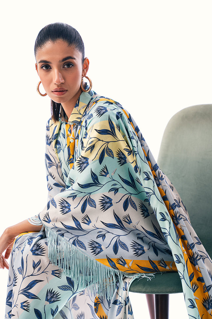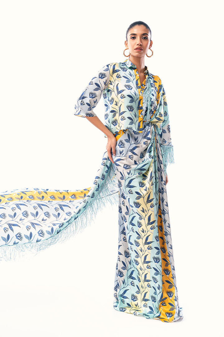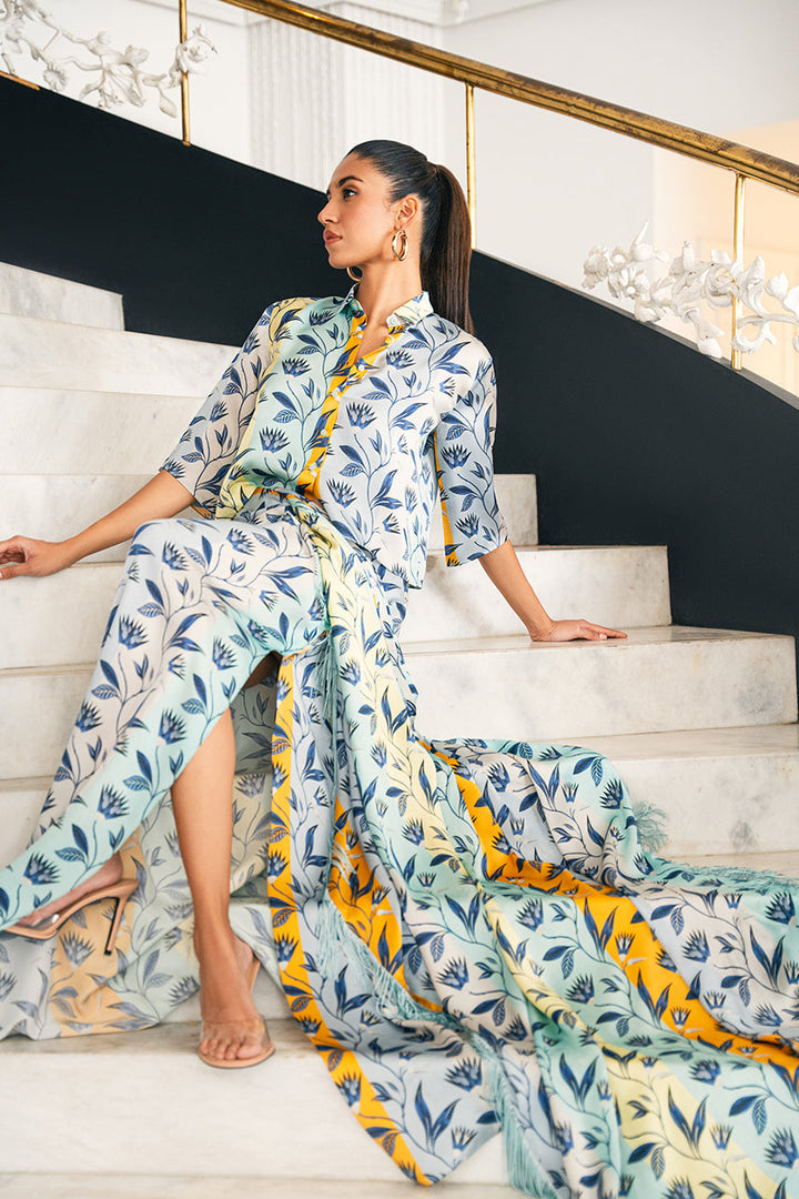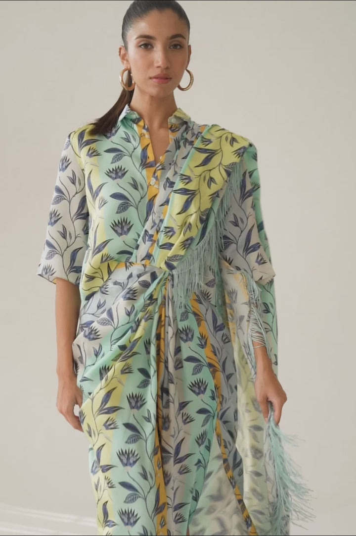 A colour blocked charmeuse sari in shades of pastel yellow, celeste blue, and mint green effortlessly draped and paired with a matching button down top. A playful fringe trim elevates the look.