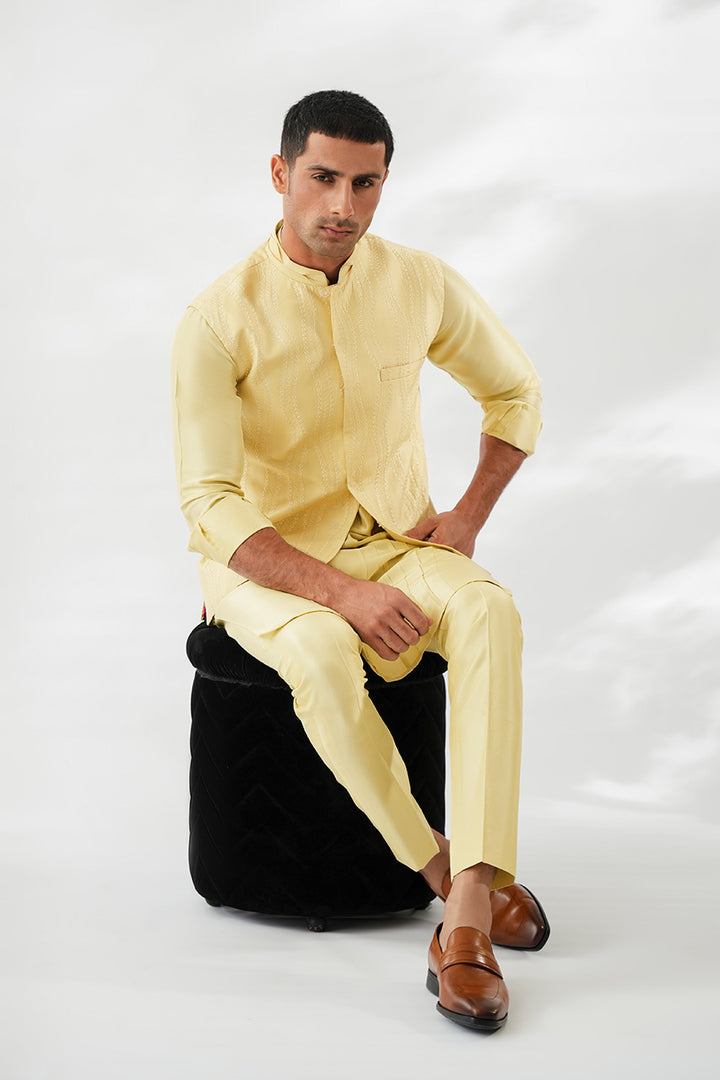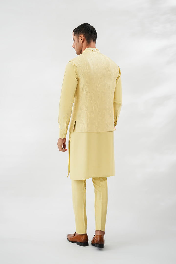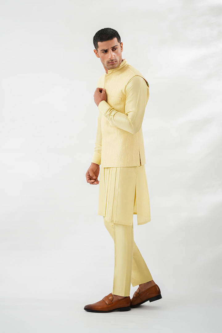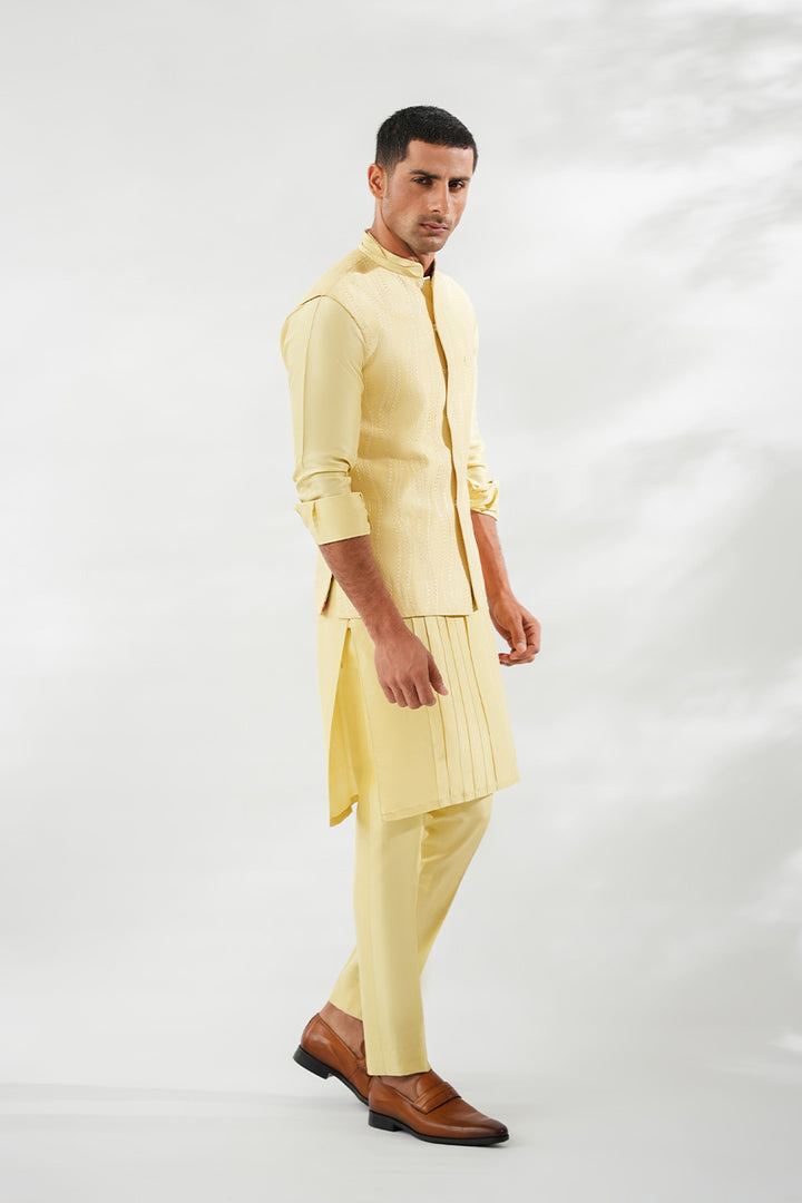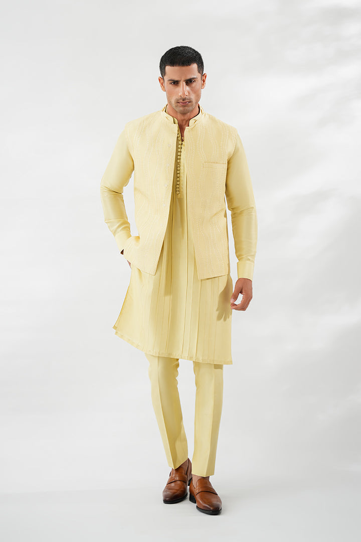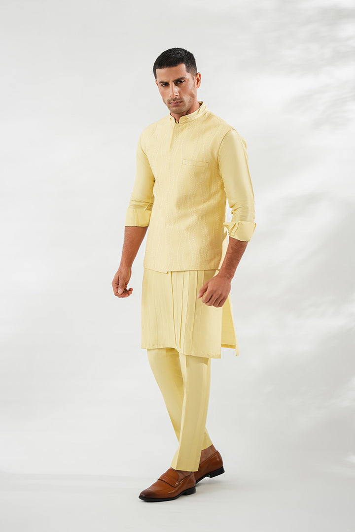 In soft butter yellow, this Boski kurta set is paired with a pure raw silk waistcoat, distinguished by tonal embroidery that ripples fluidly across the surface. The kurta is detailed with refined pintucks along the front, adding texture to its streamlined silhouette. Finished with slim pants and a collar edged in pintuck 3D detailing, the look balances modern refinement with festive elegance.