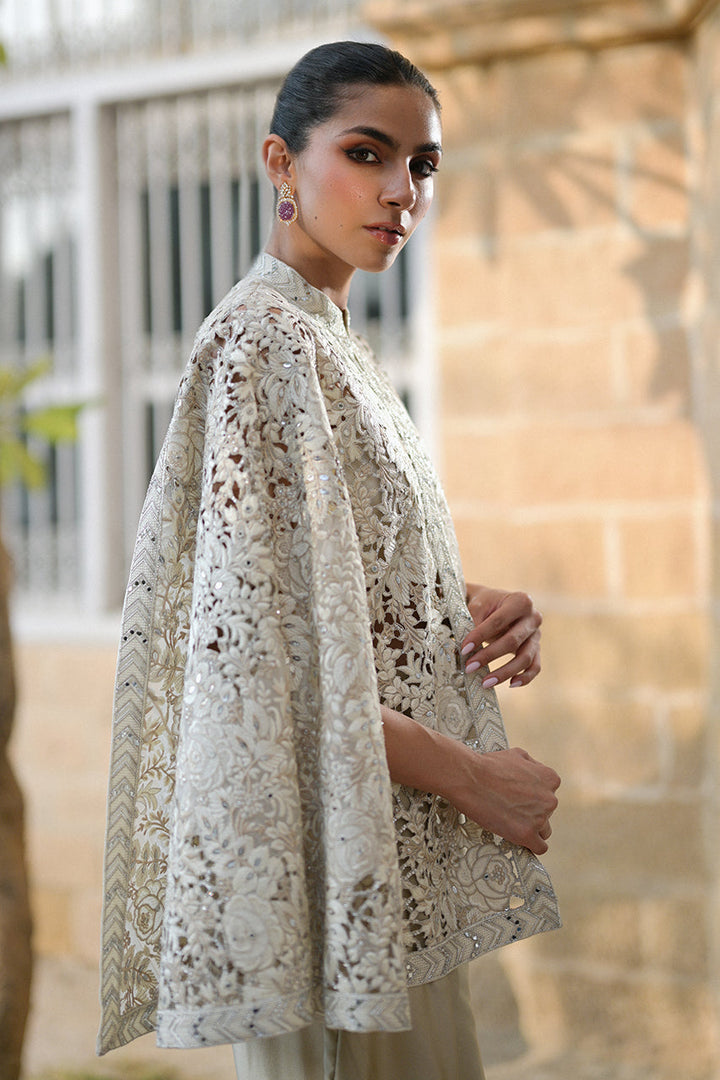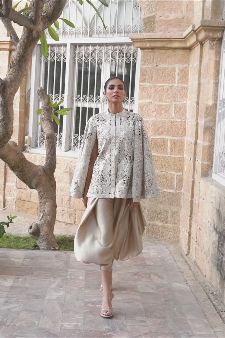 An ivory organza front open cape jacket is adorned with intricate floral threadwork embroidery and cutwork accents. Featuring exaggerated bell sleeves and embellished borders in a chevron pattern, the jacket is paired with an ivory charmeuse choli and a metallic grey draped shalwar.